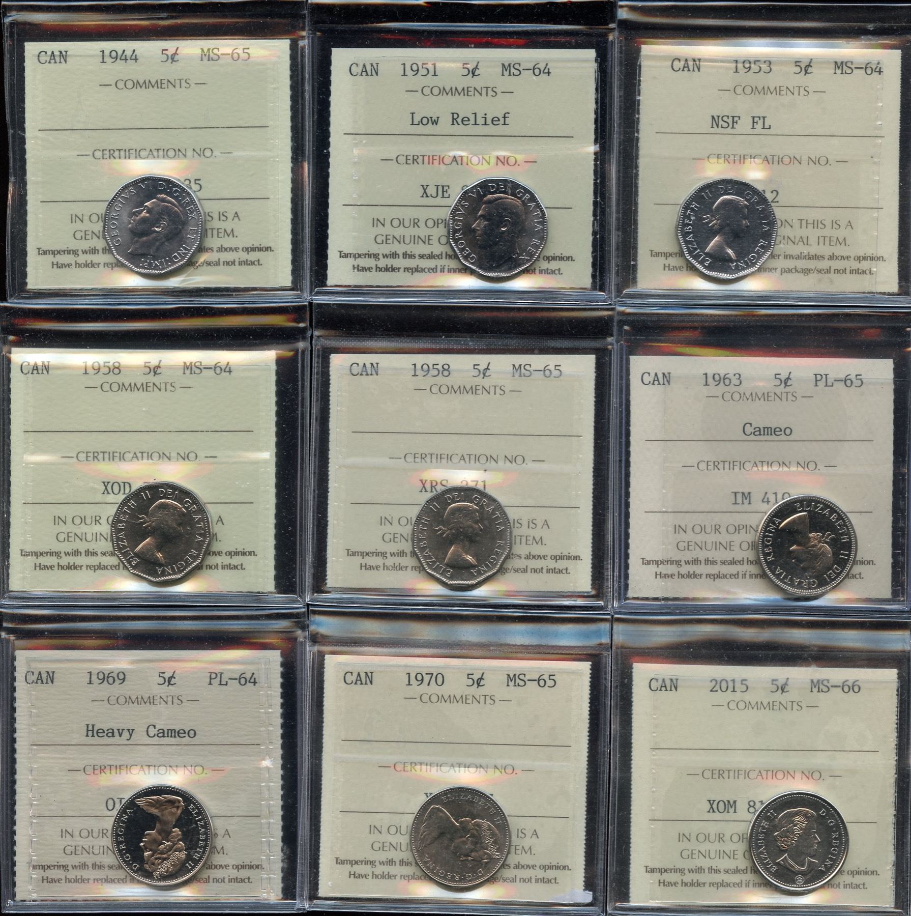 Dates include: 1944 MS-65. 1951 MS-64 Low relief. 1953 MS-64, NSF, FL. 1958 MS-64. 1958 MS-65. 1963 PL-65, Cameo. 1969 PL-64, Heavy Cameo. 1970 MS-65. 2015 MS-66. 9 Pcs.