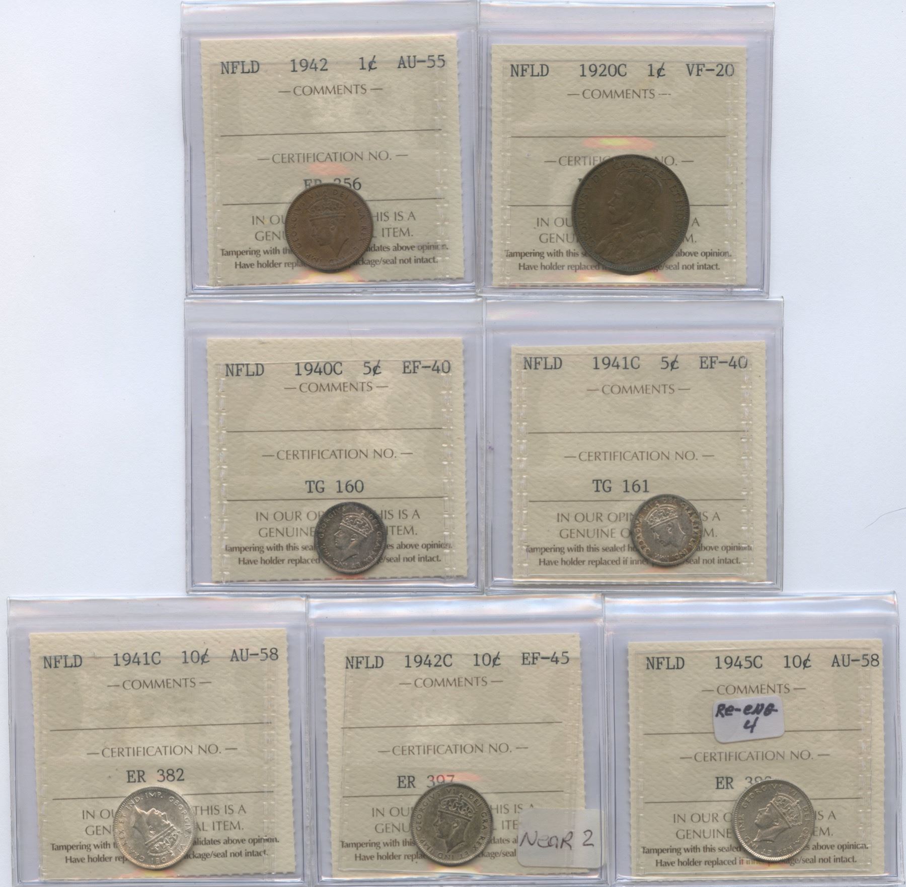 Includes: 1942 One Cent AU-55. 1920c One Cent, VF-20. 1940c Five Cents, EF-40. 1941c Five Cents, EF-40. 1941 Ten Cents, AU-58. 1942 Ten Cents EF-45. 1945c Ten Cents, AU-58. 7 Pcs.