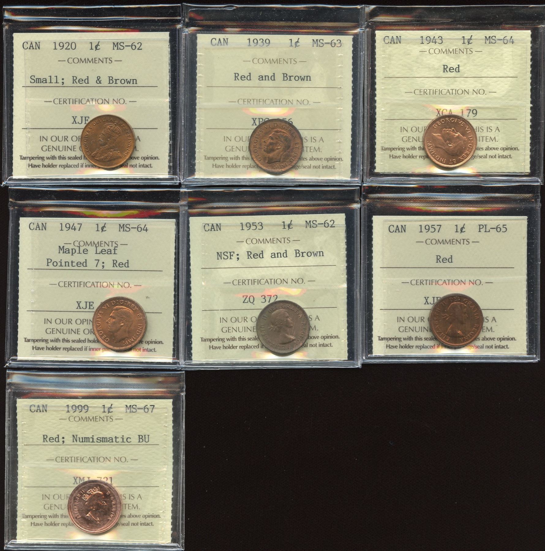 Dates include: 1920 Small MS-62, R&B. 1939 MS-63 R&B. 1943 MS-64, Red. 1947 ML, Ptd. 7, Red. 1953 NSF, R&B. 1957 PL-65, Red. 1999 MS-67, Red, NBU. 7 Pcs.