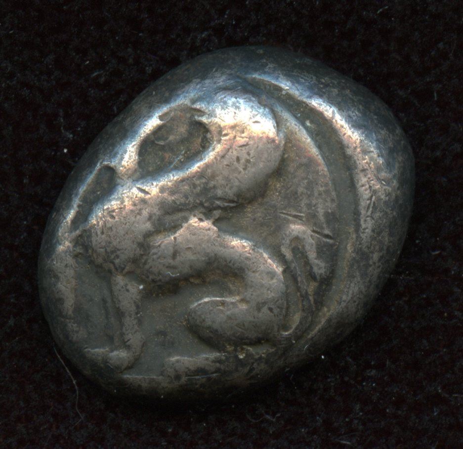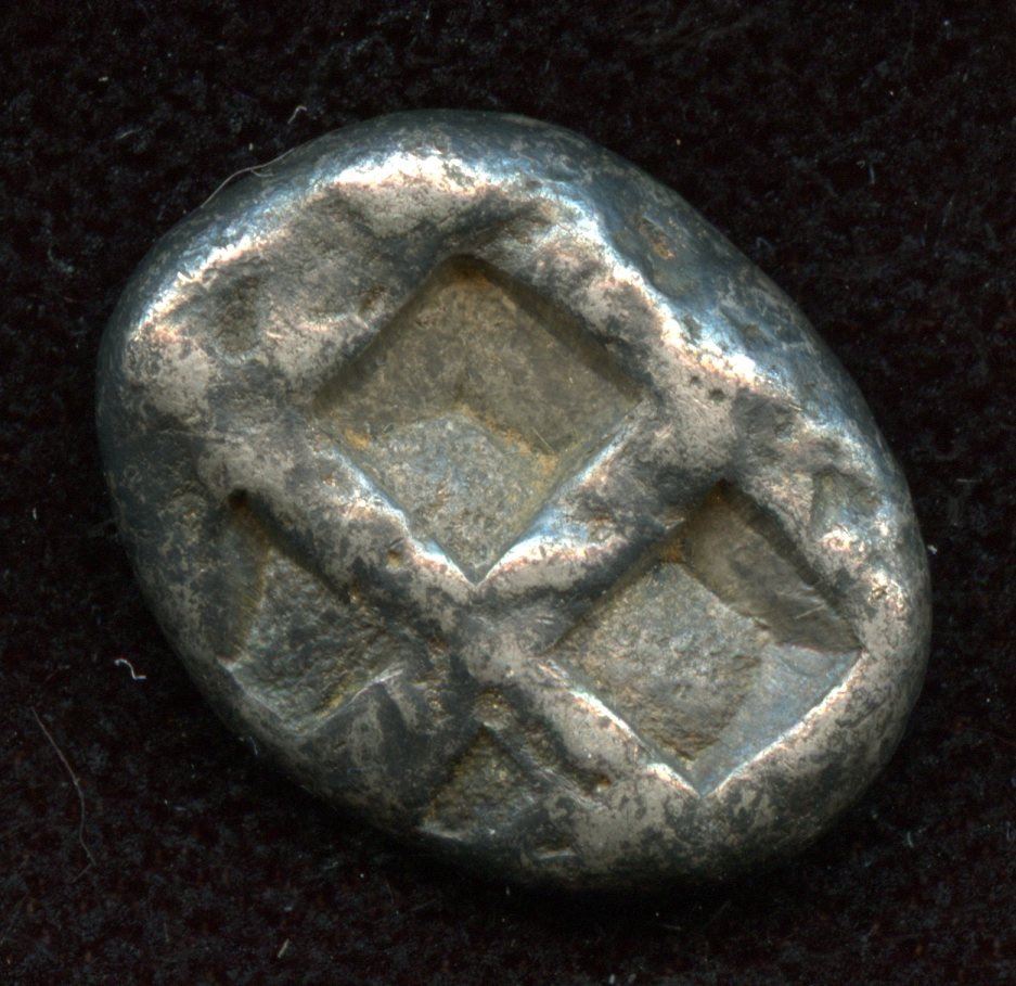 (17mm,7.83g) Sphinx facing left, on raised circular shield. Rev: Quadripartite incuse square. Sear-4594; Fine, obv off struck.