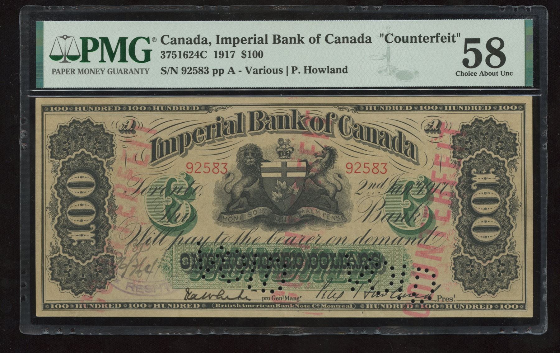 CH 375-16-24C. Perforated “VOID” twice, at signature panel and overprinted “COUNTERFEIT” numerous times, in pink ink, front and back. These interesting notes were counterfeited by the Germans during World War One. It was an attempt to undermine the Canadian financial system. However, the quality of the counterfeits was not optimal and when presented for redemption in northwest Iran, they were overprint by the Imperial Bank of Resht and then cancelled. This example is certified by PMG and graded AU-58, tied for finest graded with only two others. S/N: 92583/A.