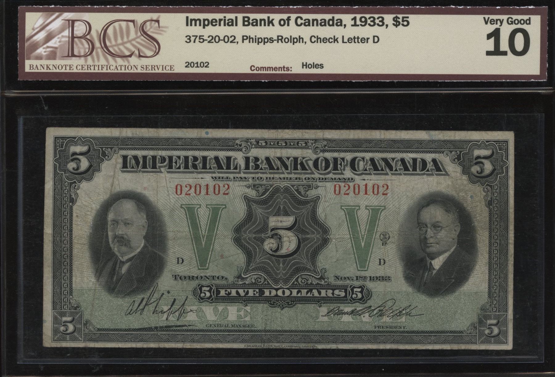 1933 Imperial Bank of Canada $5, CH 370-20-02, Phipps-Rolph, BCS Very Good 10, S/N 020102