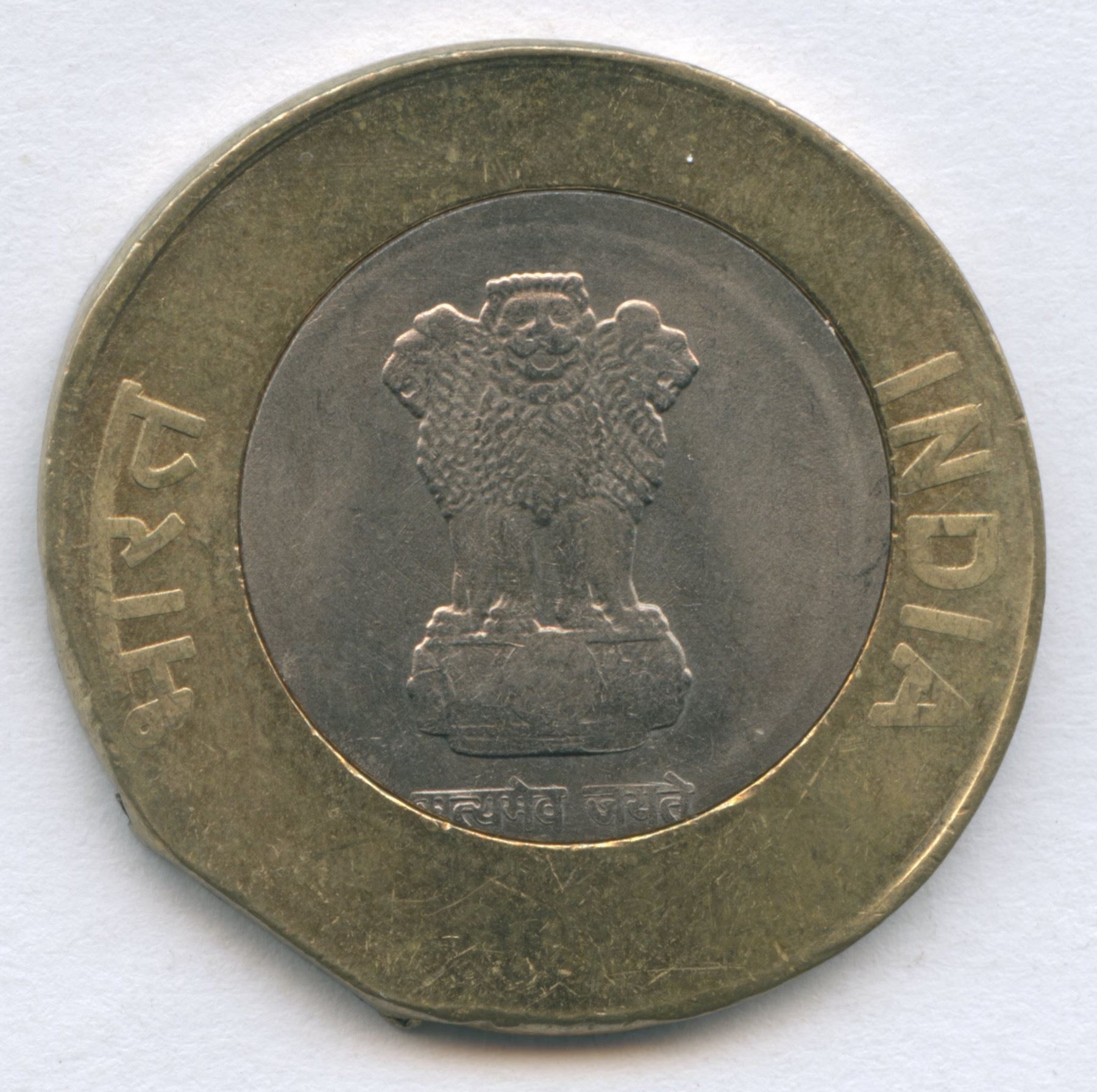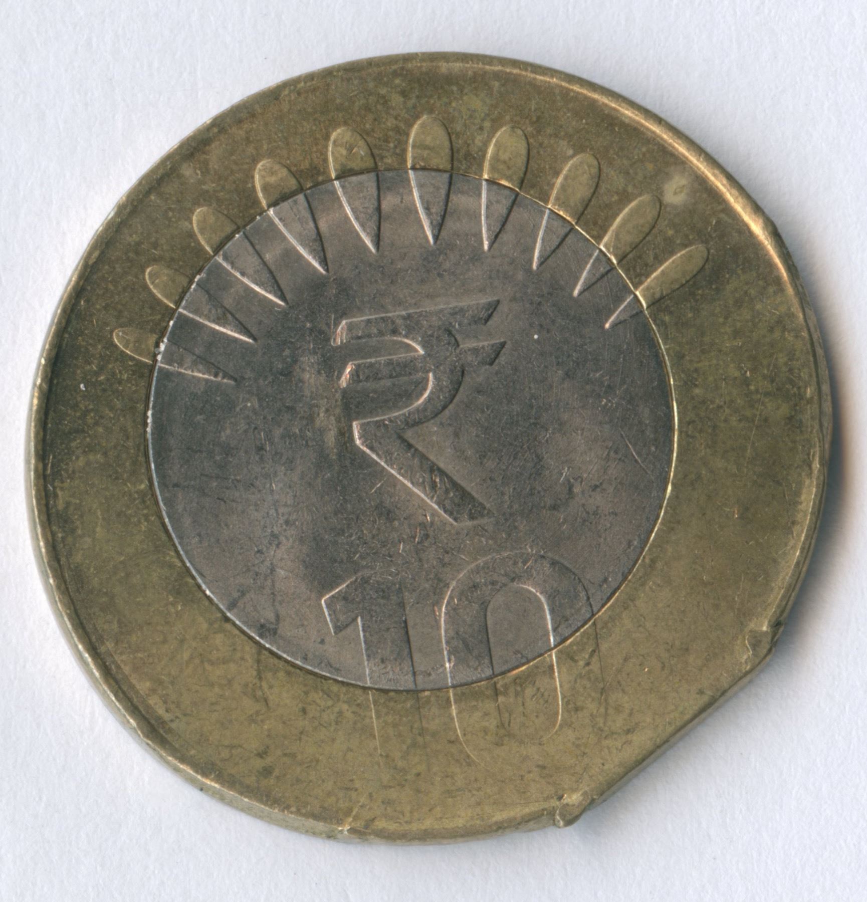 No Date (201X) India 10 Rupees, bi-metallic with core bored off-centre in an underweight (7.12 g), flawed ring that is tapered at one edge. A complex, visually appealing error, in BU condition. Patrick Glassford Collection.