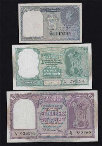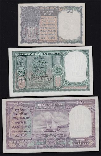 India - 1, 5, and 10 Rupees,P-25a, 36b, and 39a. Catalogues over $150. All original UNC. 3 Pcs.