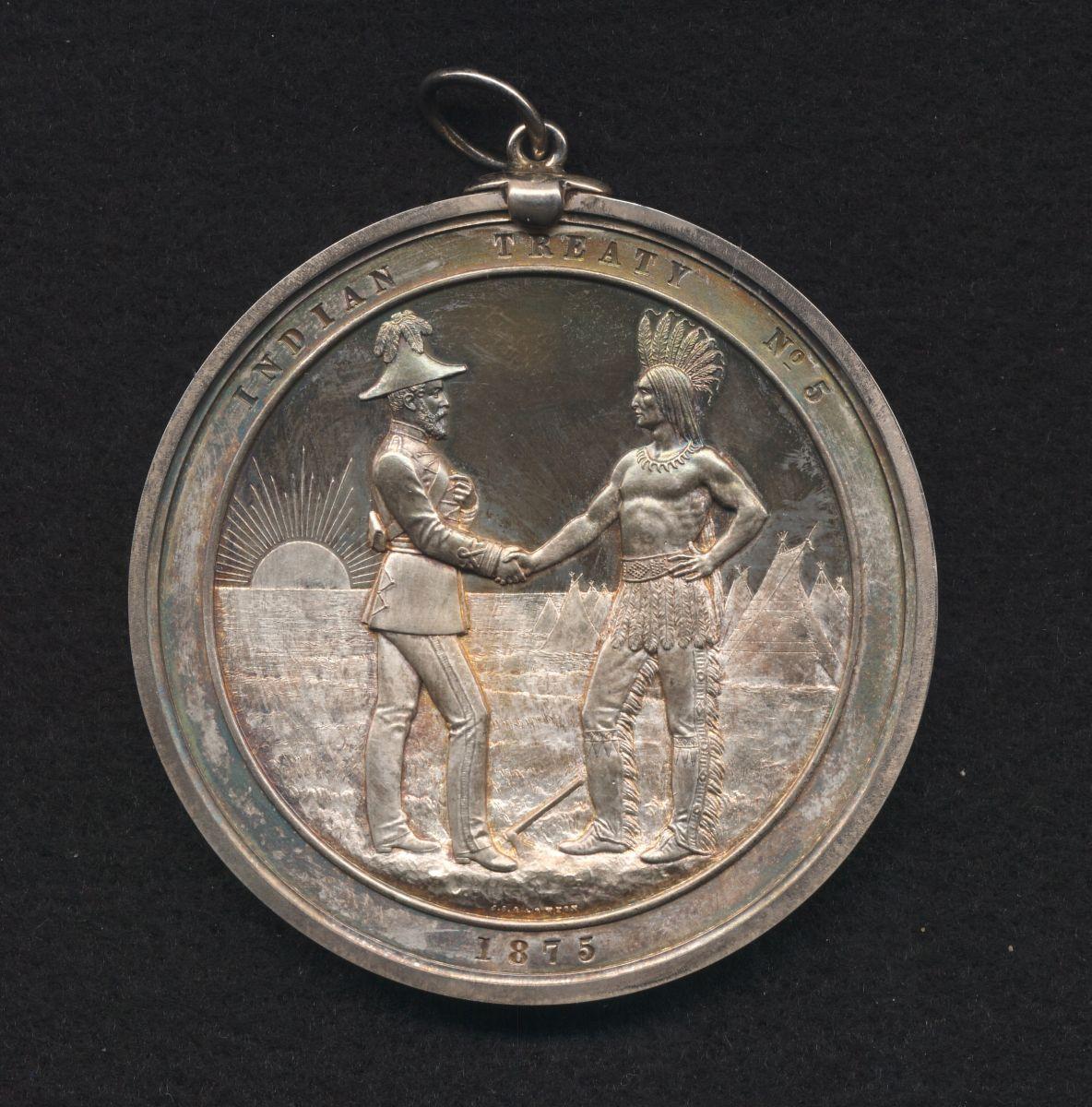 Indian Chief Medals were presented to tribal chiefs for the years 1873 to 1877 to commemorate Treaties numbered 3, 4, 5, 6 and 7. It should be noted the last digit in the date corresponds to the Treaty number.i.e. 1875 - Treaty No. 5. Each Treaty was concerned with vast Indian lands ceded to the Canadian Government. Treaty No. 5 was signed September 20th & 24th 1875 with the Saulteaux and Swampy Cree Indians. Ex. JD Ferguson, Kolman, J.J. Ford