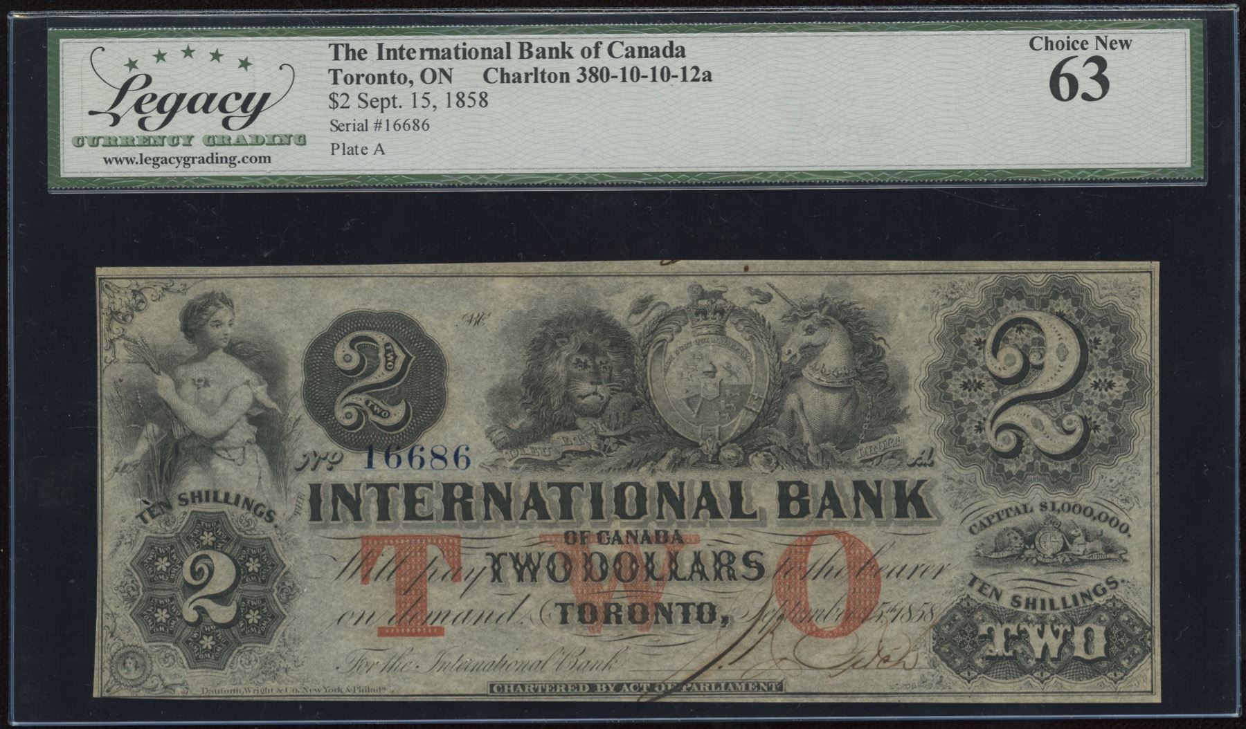 CH 380-10-10-12a. Featuring a beautiful allegorical female and royal crest. One signature, red protectors. Uncirculated notes are not commonly seen. S/N: 16686/A.