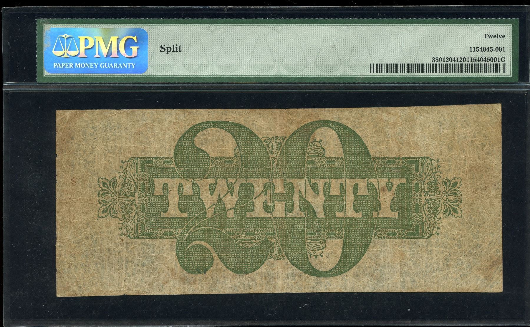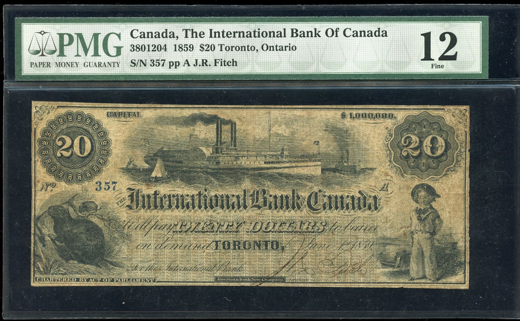 CH 380-12-04. PMG Fine 12, small split at left center. Large beautiful paddlewheel steam ship center vignette. S/N:357/A. Very difficult note to obtain in better conditions. Highly underrated note.