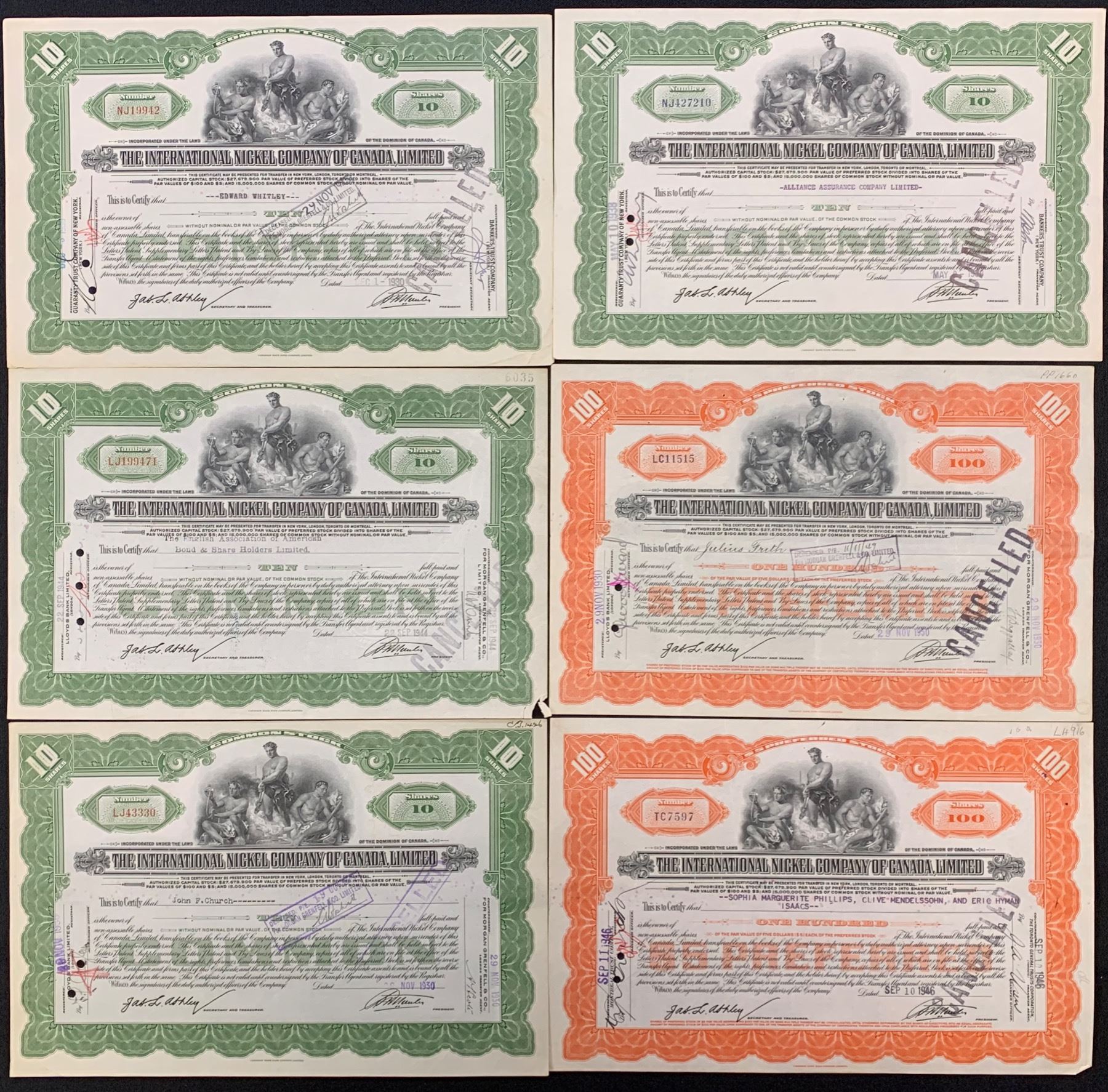 Each has a vignette of allegorical men associated with metal refining. Four green certificates for 10 shares, and two orange certificates for 100 shares, issued between 1930 and 1946. Average EF condition, one has a damaged corner.