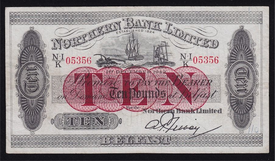Ireland (Northern) Northern Bank Ltd 10 Pounds. P-181c. Red "TEN" overprint on front. Attractive Northern Bank Limited 10 Pounds 1 Dec 1942, lightly pressed Very Fine.