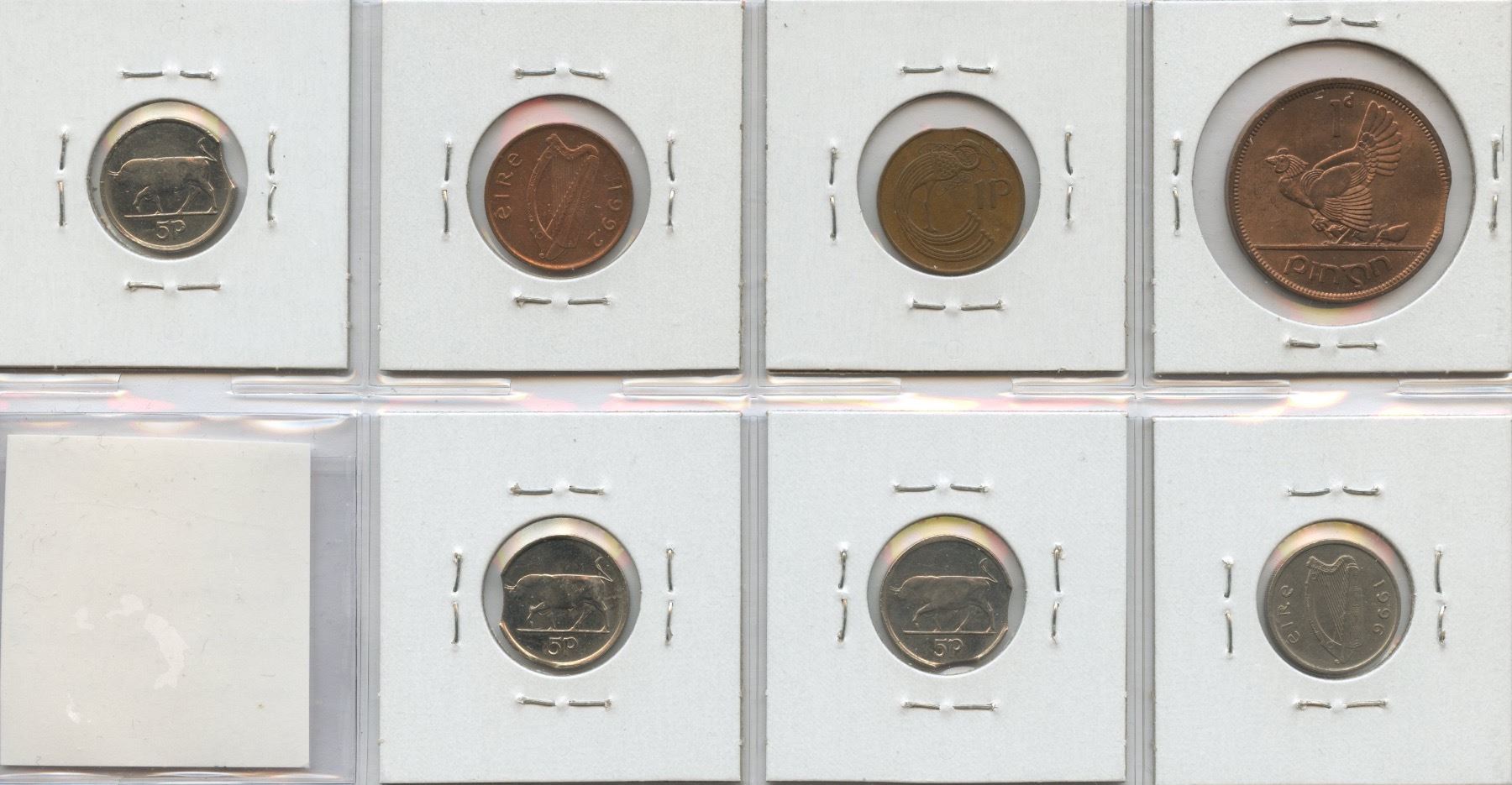 Lot of 8 error coins from Ireland, 1P to 5P, and includes a coin struck on a foreign planchet. Patrick Glassford Collection.