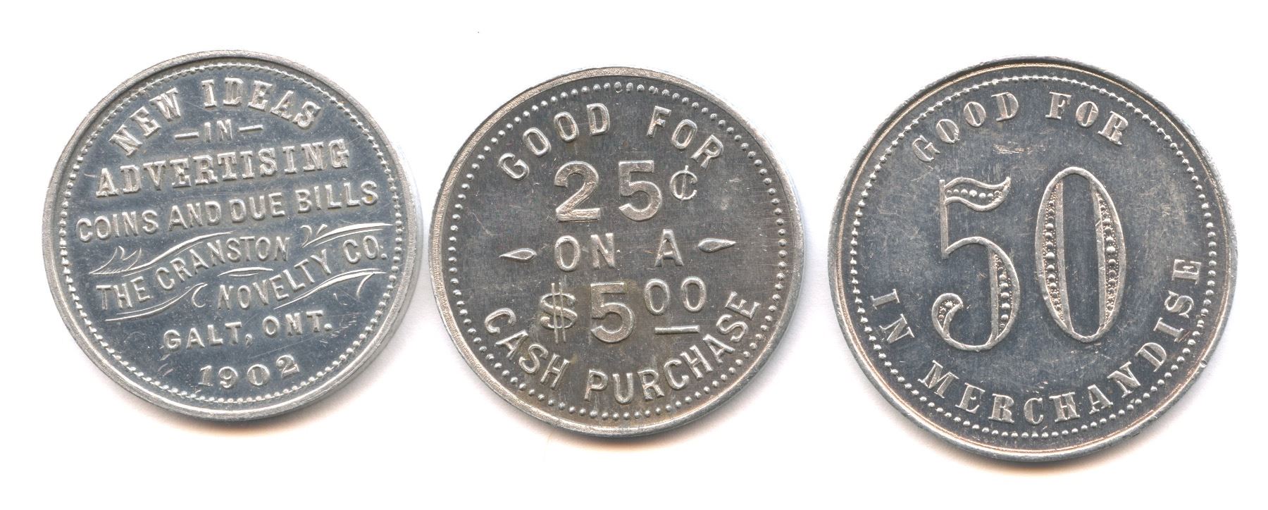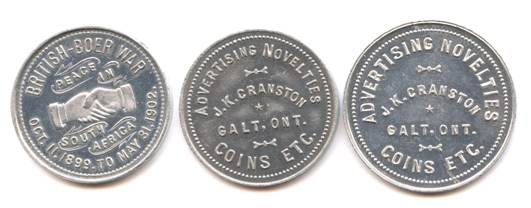 Lot of three (3) tokens. 1.) 404-G-A, 28.1mm, British Boer War - Peace in South Africa 1902. 2.) McColl-900, 404-L-I, 28.1mm, Good For 25c on a $5.00 Cash Purchase. 3.) McColl-897, 404-L-E, 30.8mm, Good For 50 in Merchandise. All Unc.