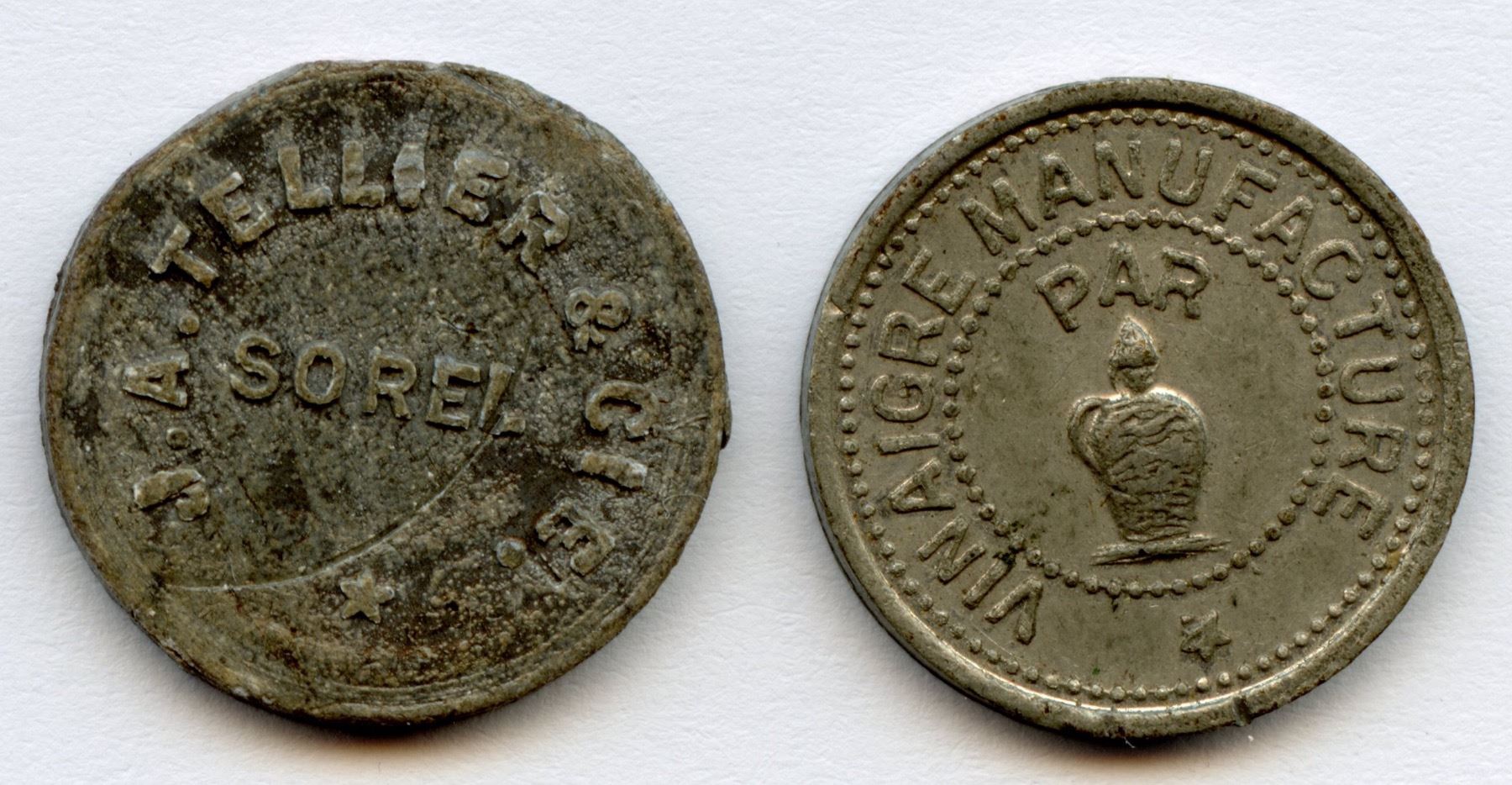Br 661. J. A. Tellier & Cie. Advertising Token, Sorel (twenty specimens were in the hands of J. O. Marchand). Br 662. J. A. Tellier & Cie Advertising Token, Sorel. Vinegar Manufacturers. (31 issued by J. O. Marchand). Only exceeded in rarity by the Cardinal token. 2 pcs.
