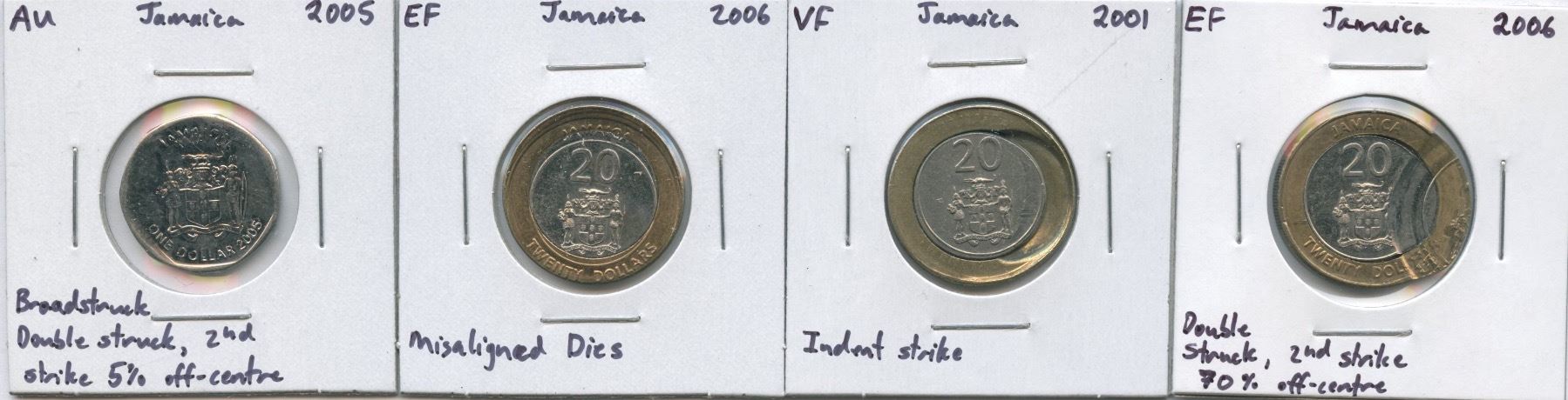 Lot of 4 Jamaica errors, all are visually significant striking errors, which includes a coin that was double struck, both times broadstruck. Patrick Glassford Collection.