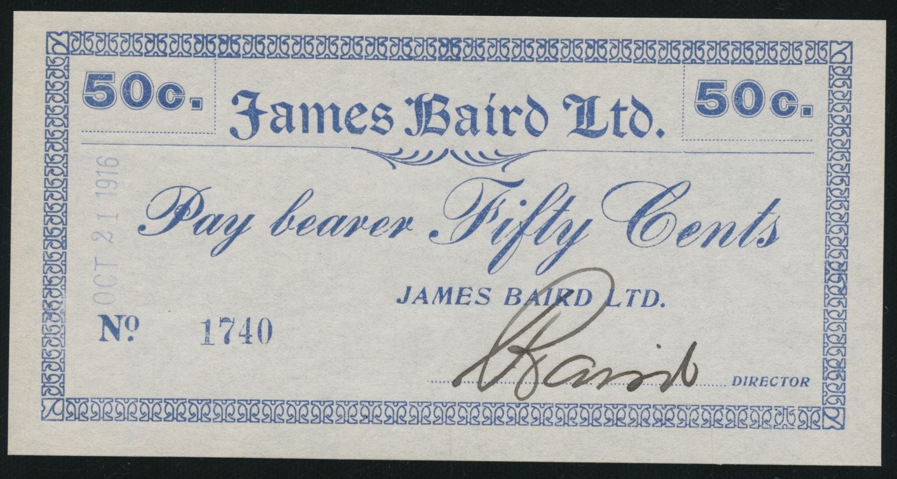 CH NL10-10-02. PMG Choice Unc. 64 EPQ. James Baird came to NL in 1844 from Scotland. He started in the export & drapery businesses but soon expanded into groceries, wines/spirits & fisheries. Baird survived the 1894 bank failures and in fact bought out several competitors. In 1908, Baird's sons assumed control of the business. The scrip have just recently been discovered and were not included in Rowe's bible of Newfoundland numismatics. Rare. S/N:1740.