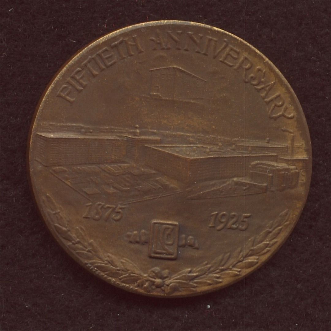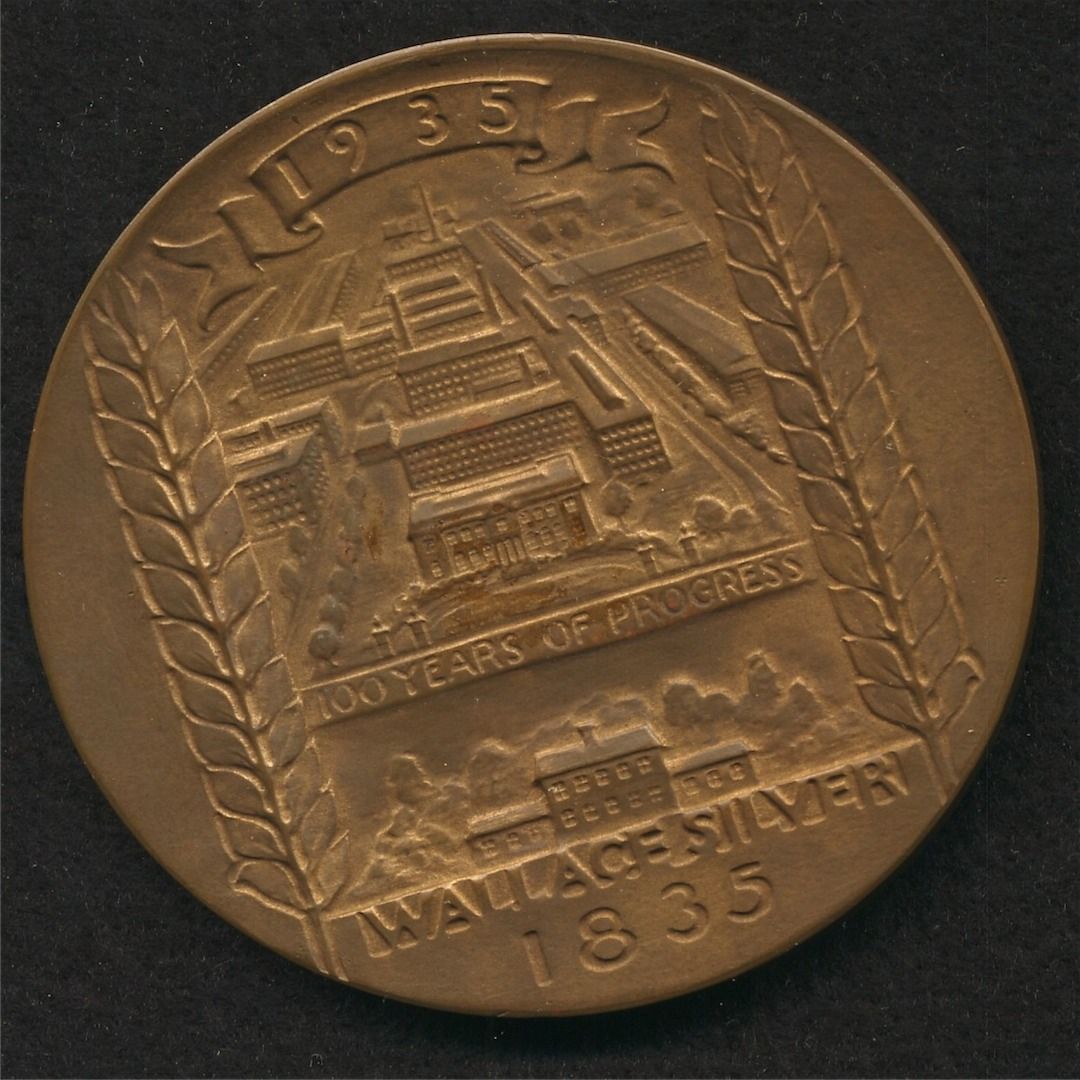 John D. Larkin, Wallace Silver - 1. Larkin established soap factory in Buffalo in 1875 and added many new and innovative businesses, bronze, 38 mm, EF; 2. Centennial commemoration of Wallace silver, factory buildings pictures with bust of Robert Silver on reverse, bronze, 75 mm, EF. 2 Pcs.
