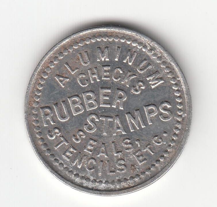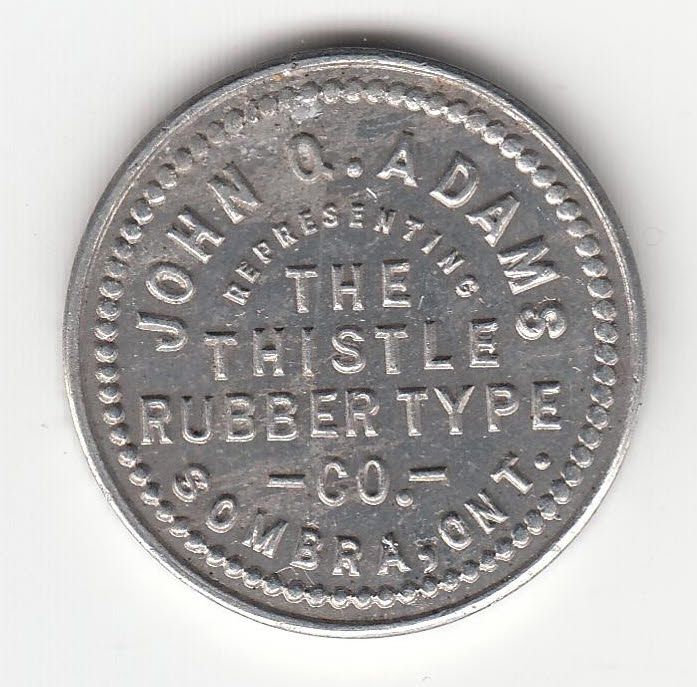 John Q. Adams Representing The Thistle Rubber Type Co. Sombra, Ont., Aluminum Checks Rubber Stamps Seals, Stencils, etc. Alum, 25mm, VF.