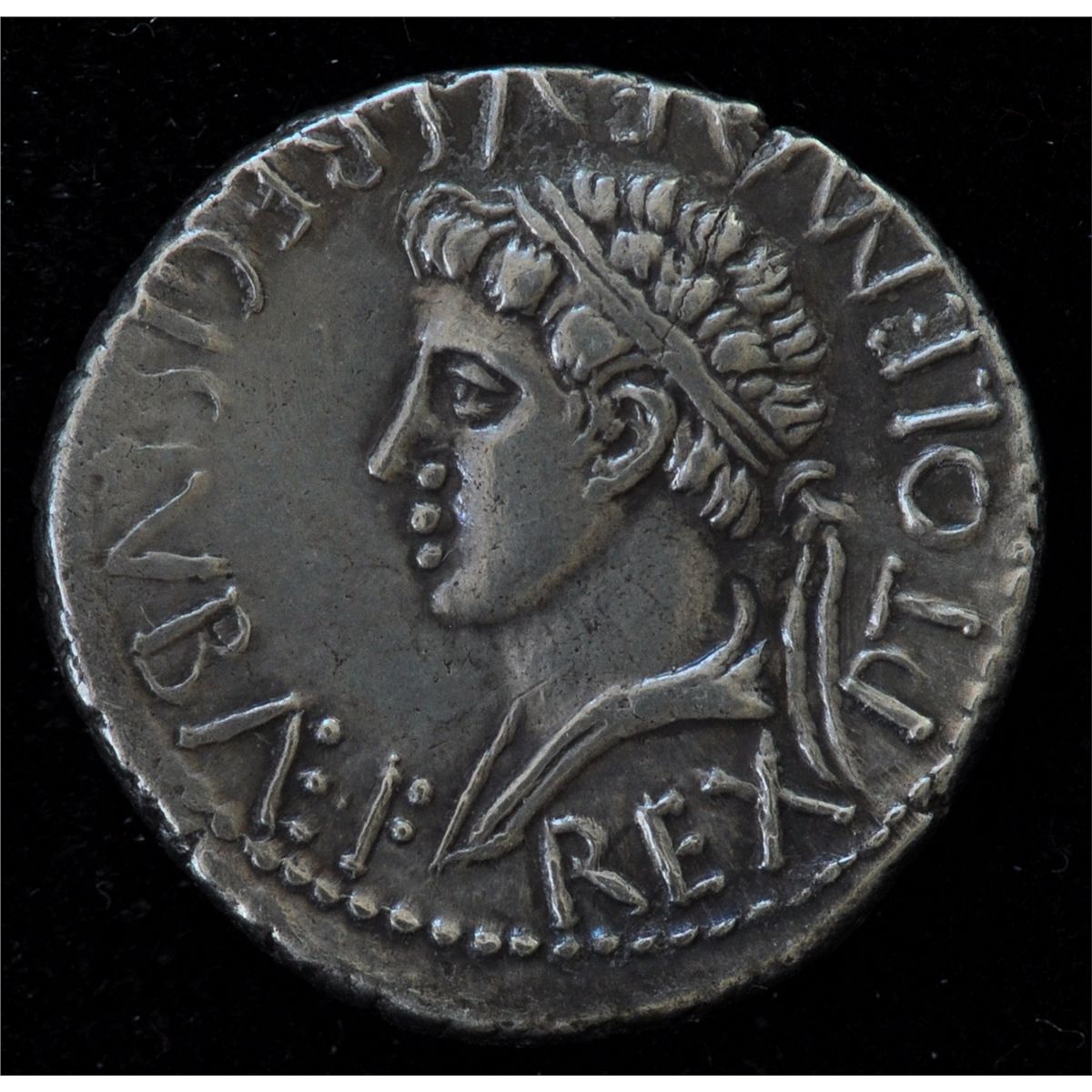 Juba II with Ptolemy - Caesarea AR-Denarius. Obv: REX IVBA, diad. hd. r. Rev: REX PTOLEMAEVS REGIS IVBAE F, diad. Hd. of Ptolemy l., 3.3 grams. Mazard 379. Lightly toned EF. Rare.