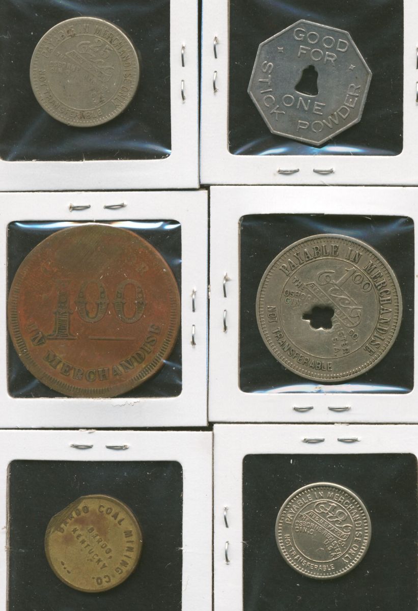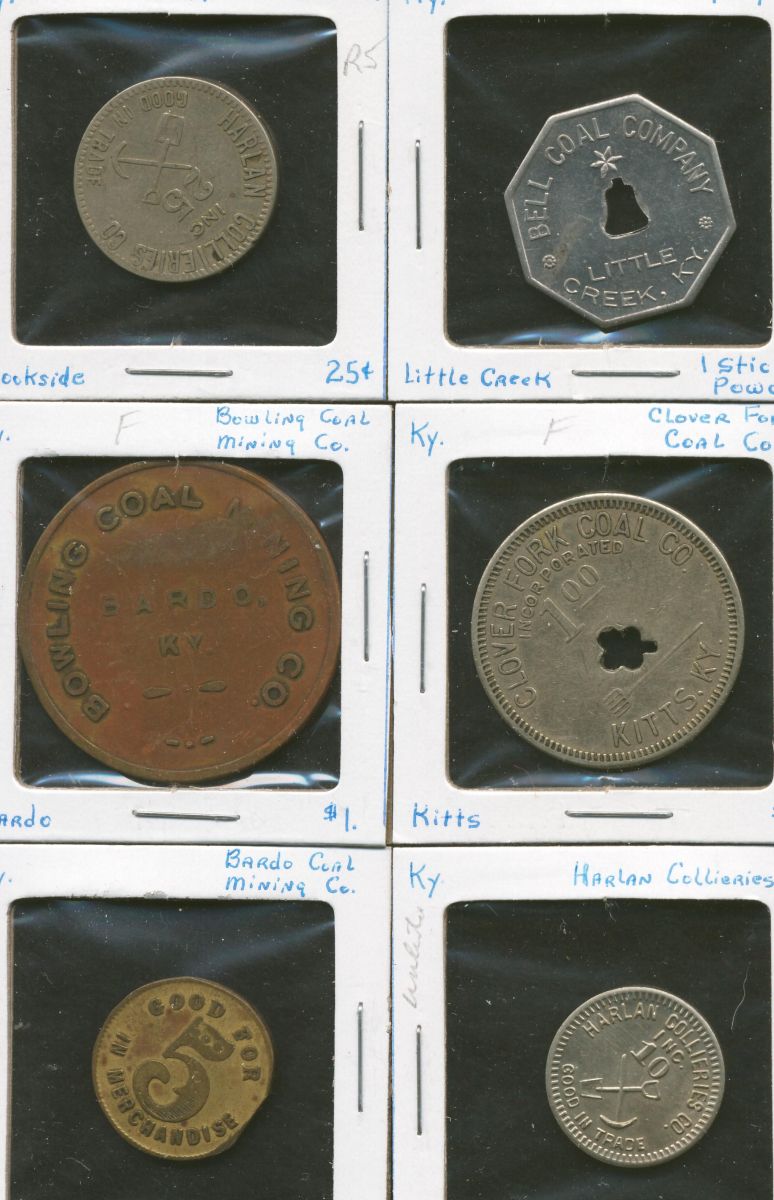 KY - Bardo Coal Mining Co. 5 c. R3. KY - Bardo Coal Mining Co. $1.00. R3. KY - Kitts Clover Fork Coal Co.$1.00 R5. KY - Bell Company - deleted from catalogue. KY - Harlan Collieries 5c. R5. KY - Harlan Collieries 25c. R5.