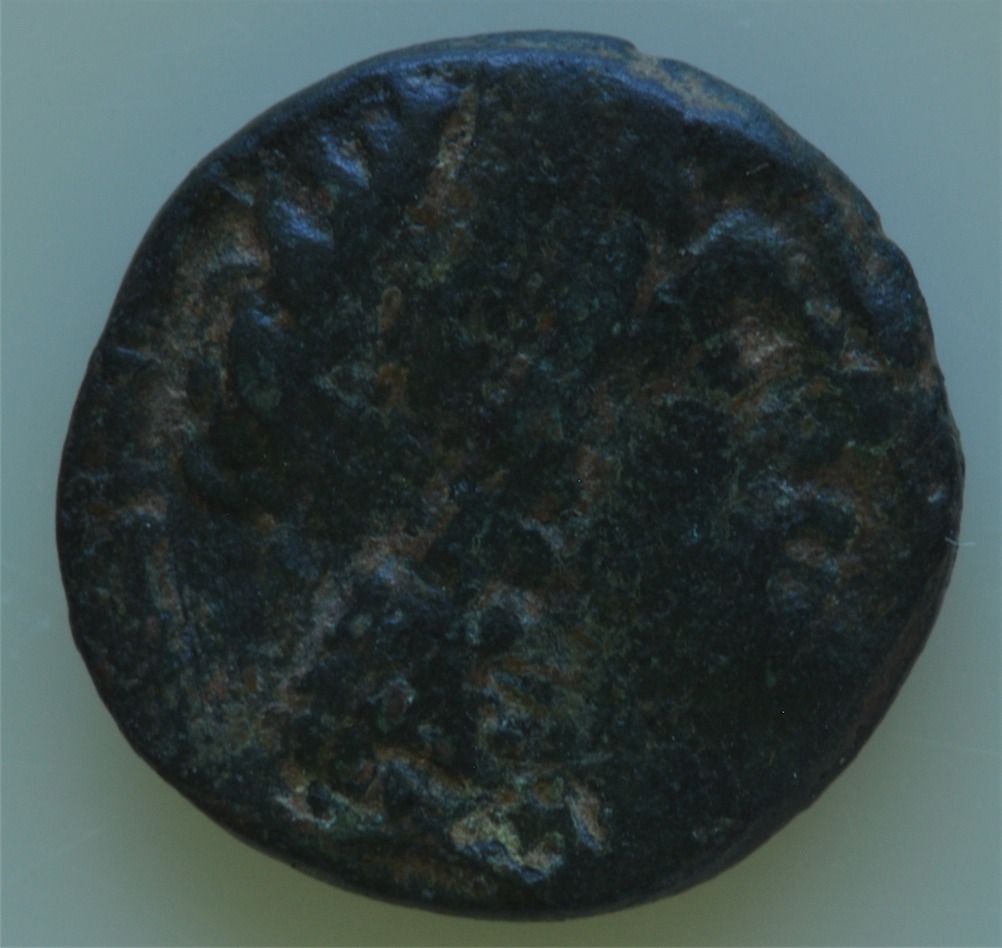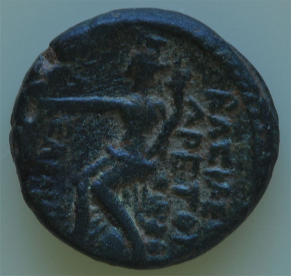Kingdom of Nabataea Damascus (87-62 BC) - AE-19 Aretas III Obv: Diad. hd. r. of Aretas Rev: City god of Damaskos seated l. on a rock r. hands extended, holding Cornucopia, very clear legend. 6.7 grams S-6109 VF+.