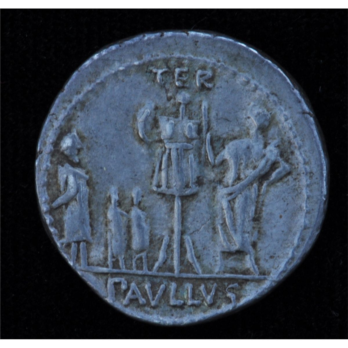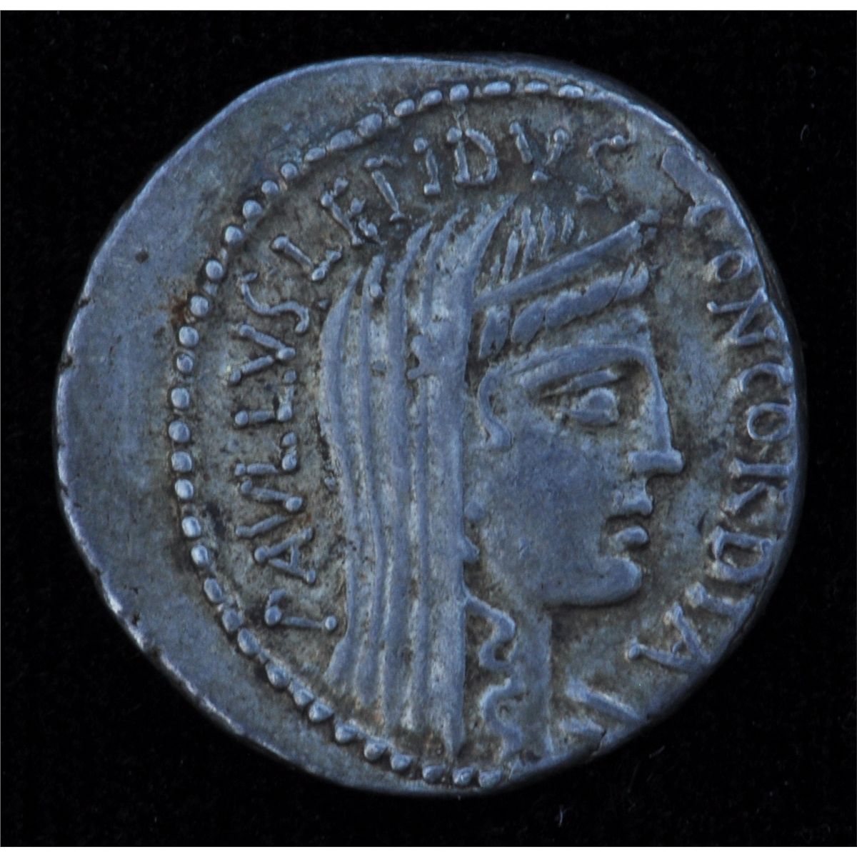 L. Aemilius Lepidus Paullus (62 BC) - AR-Denarius Obv: Veiled and dr. head of Concordia r. PAVLLVS LEPIDVS CONCORDIA. Rev: Togate figure of Paullus stg.l. , touching trophy to l., left of trophy are captives, King Perseus and 2 sons. 4.0 grams S-366 Craw 415-1, Ex:Harlan Berk, Toned EF.