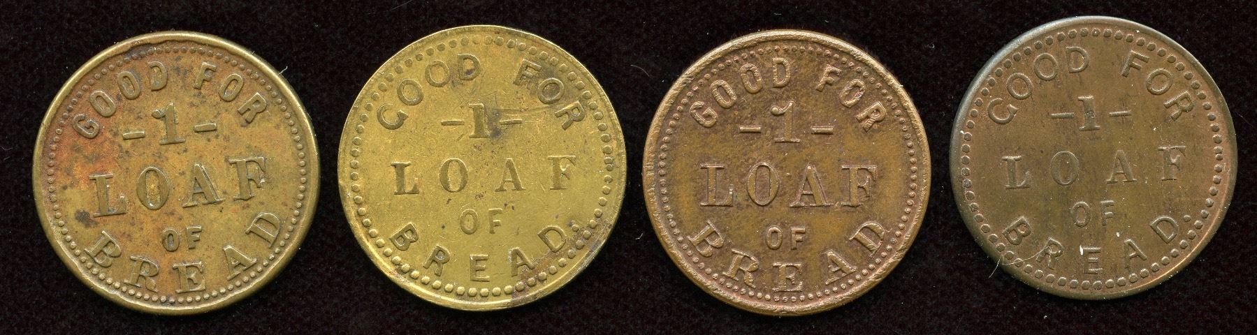 Br. 743, Astwood 1230h, 1 Loaf, brass, EF; Br. 743, same as previous but period after Bread and letting is smaller; Br. 743, Astwood 1230i, 1 Loaf, copper, EF; Br. 743, Astwood 1230j, same as previous but period after Bread and letting is smaller, EF. 4 Pcs.
