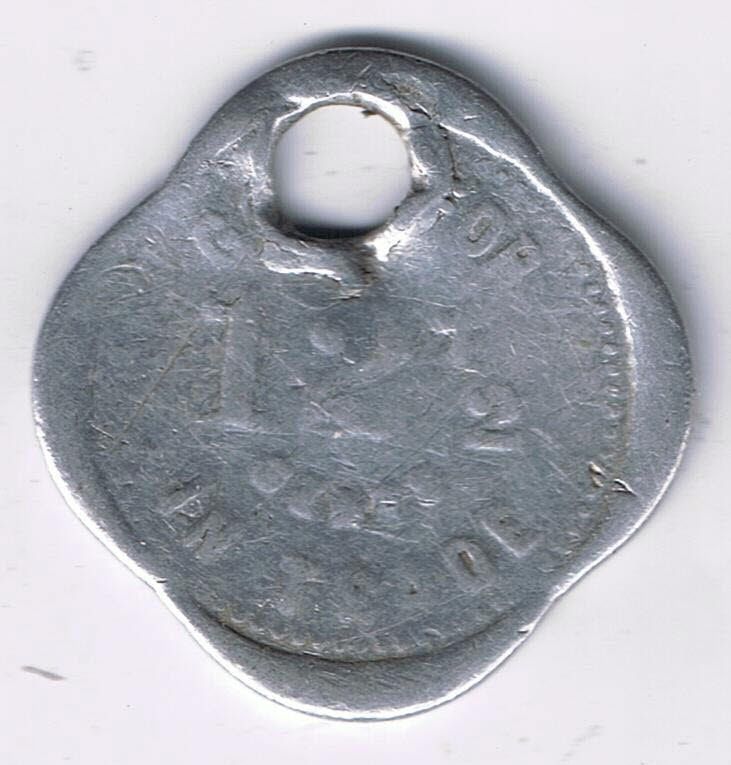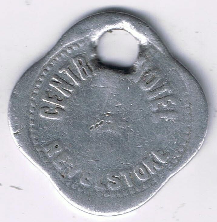 LH- R0860d. Central Hotel Revelstoke, Good for 12 1/2 cents in trade. Alum., 28mm, 1.6g, Good with large hole at top. Scarce.