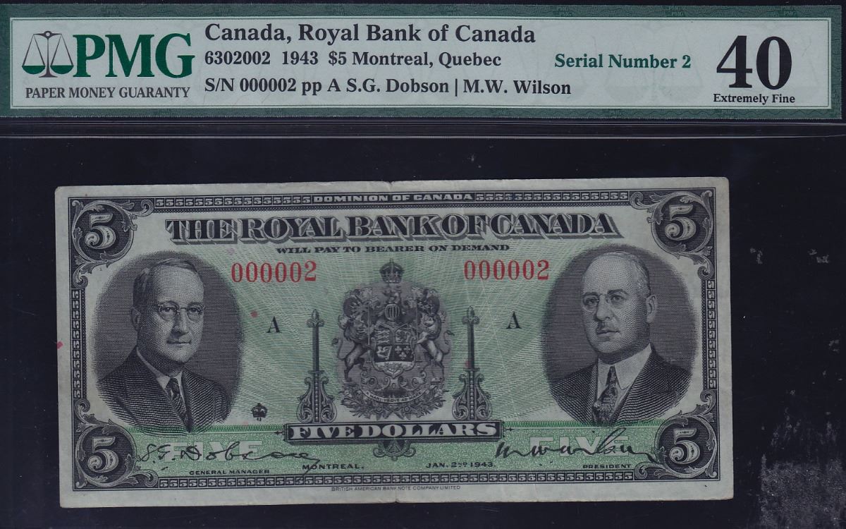LOW SERIAL #2 - Royal Bank of Canada $5, 1943