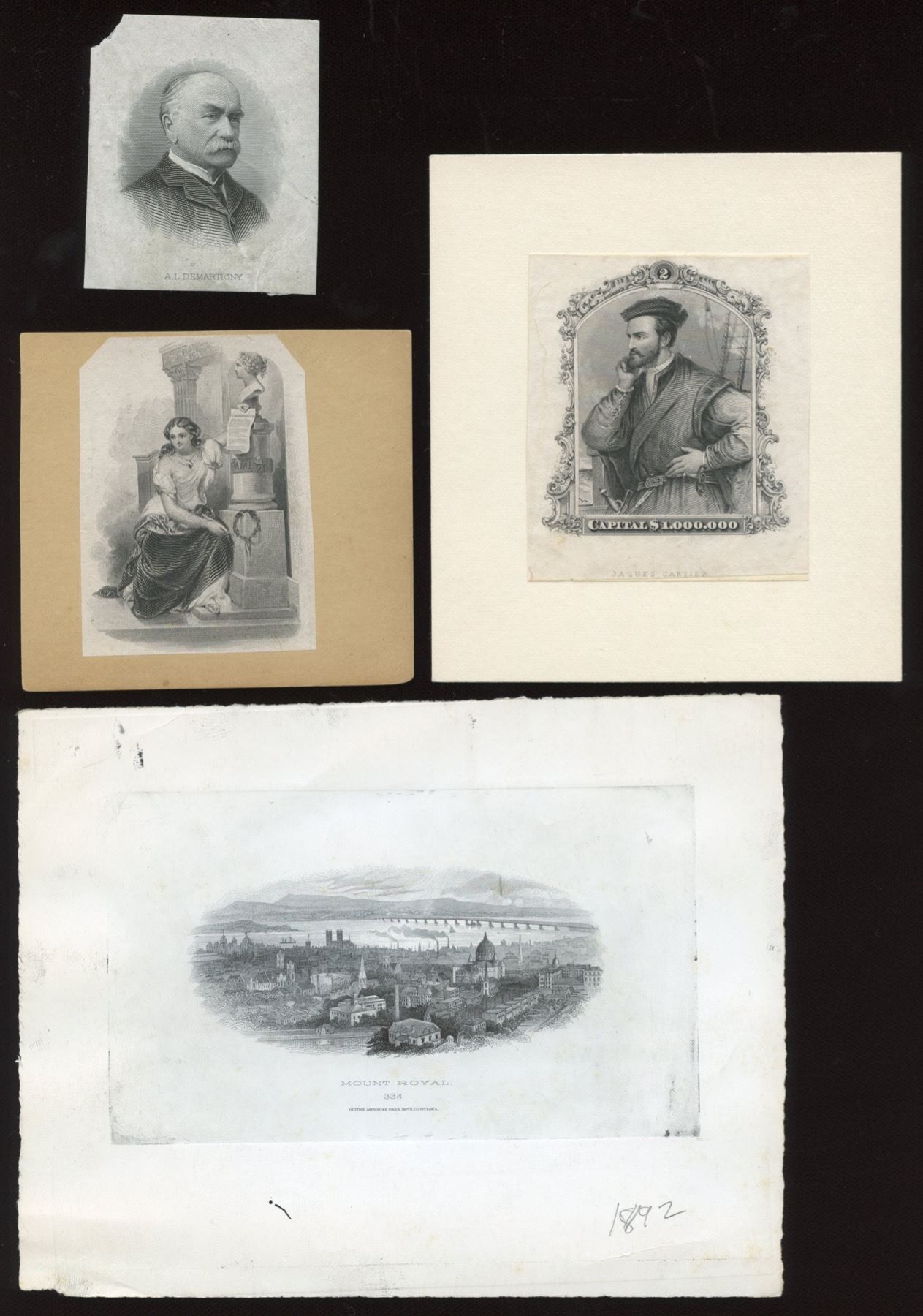 Jacques Cartier aboard ship, chin in hand, on 1862 $2. ABNCo has entitled this vignette "Jaques Cartier" - they engraved better than they spelled. Seated female with parchment, seen in reduced format at left on the 1870 $50; A. L. DeMartigny as seen at left on both denominations of the 1895 issue, and the view of Montreal under the V on the $5 of the same issue, BABN #334, "Mount Royal". Four vignettes, the second and third cut down, and the third has a bit of the top corner missing, not affecting the printed area; the last on glazed paper.