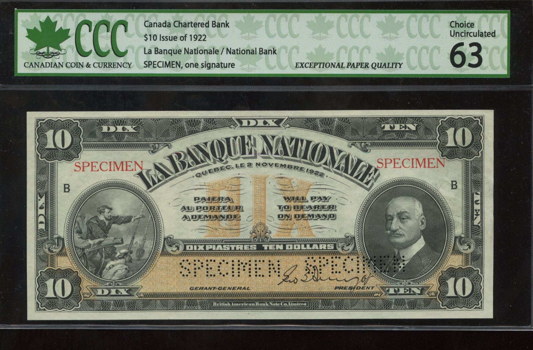 CH-510-20-04S, CCC Choice Uncirculated 63 EPQ. A popular "SPECIMEN" for banknote collectors, with vivid colours and details.