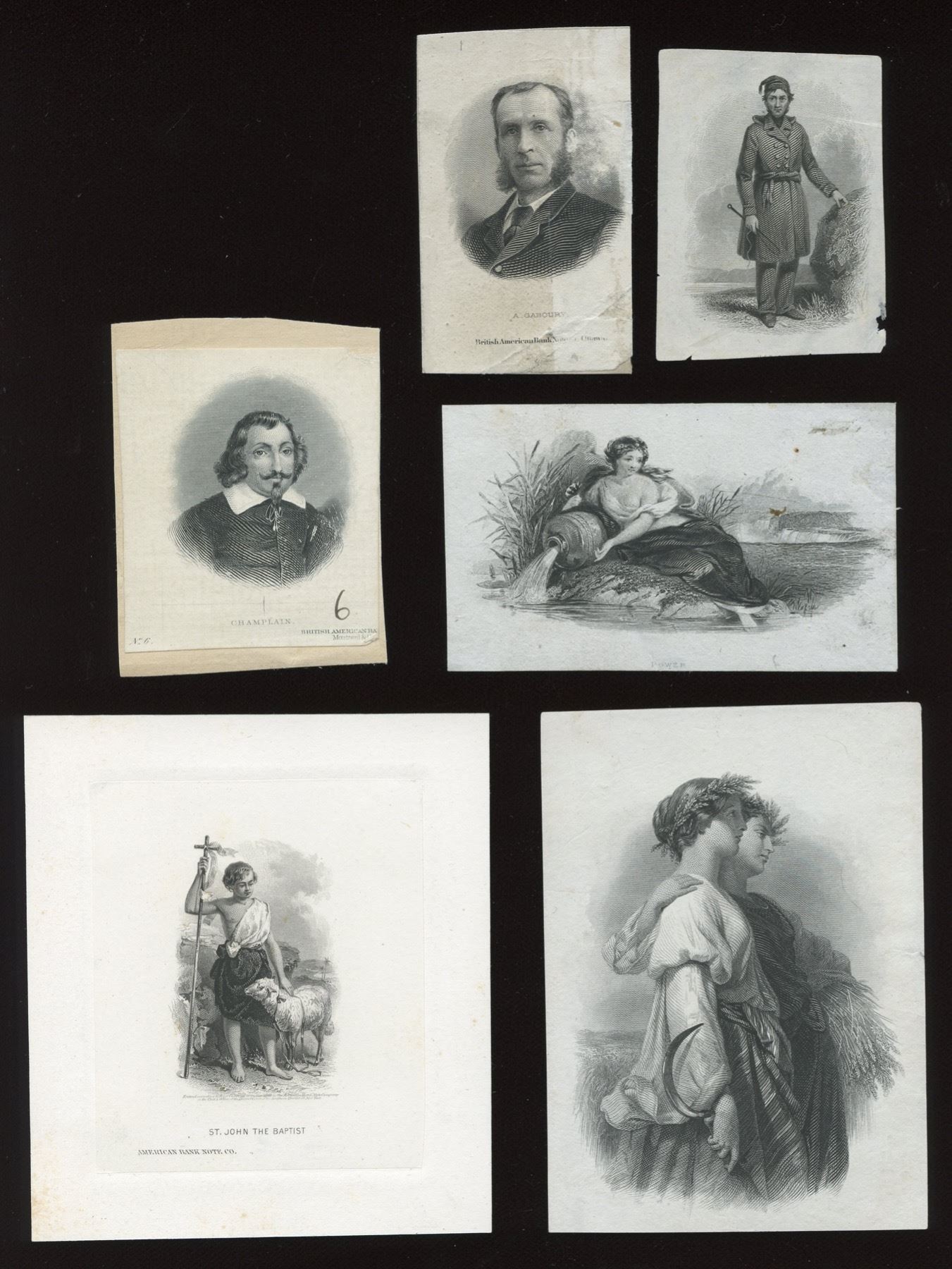 La Banque Nationale, die proof vignettes, Habitant (1860 $1); "The Reapers" (1860 $2); St. John the Baptist (1860 and 1873 $10); "Power" (1871 $50);"Champlain" (1883-1897 $5); A. Gaboury portrait, cut down and moderately damaged. Six die proof vignettes.
