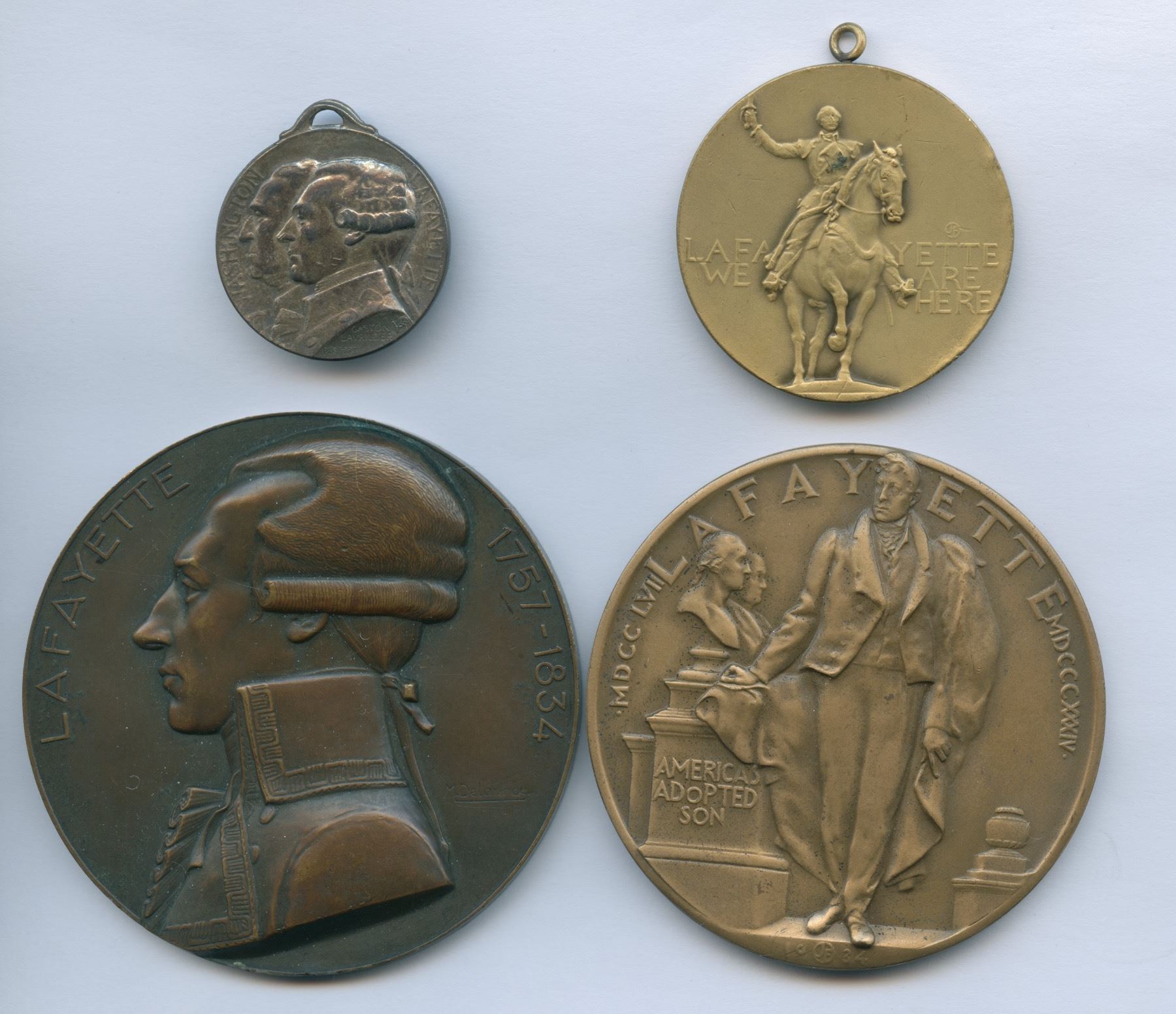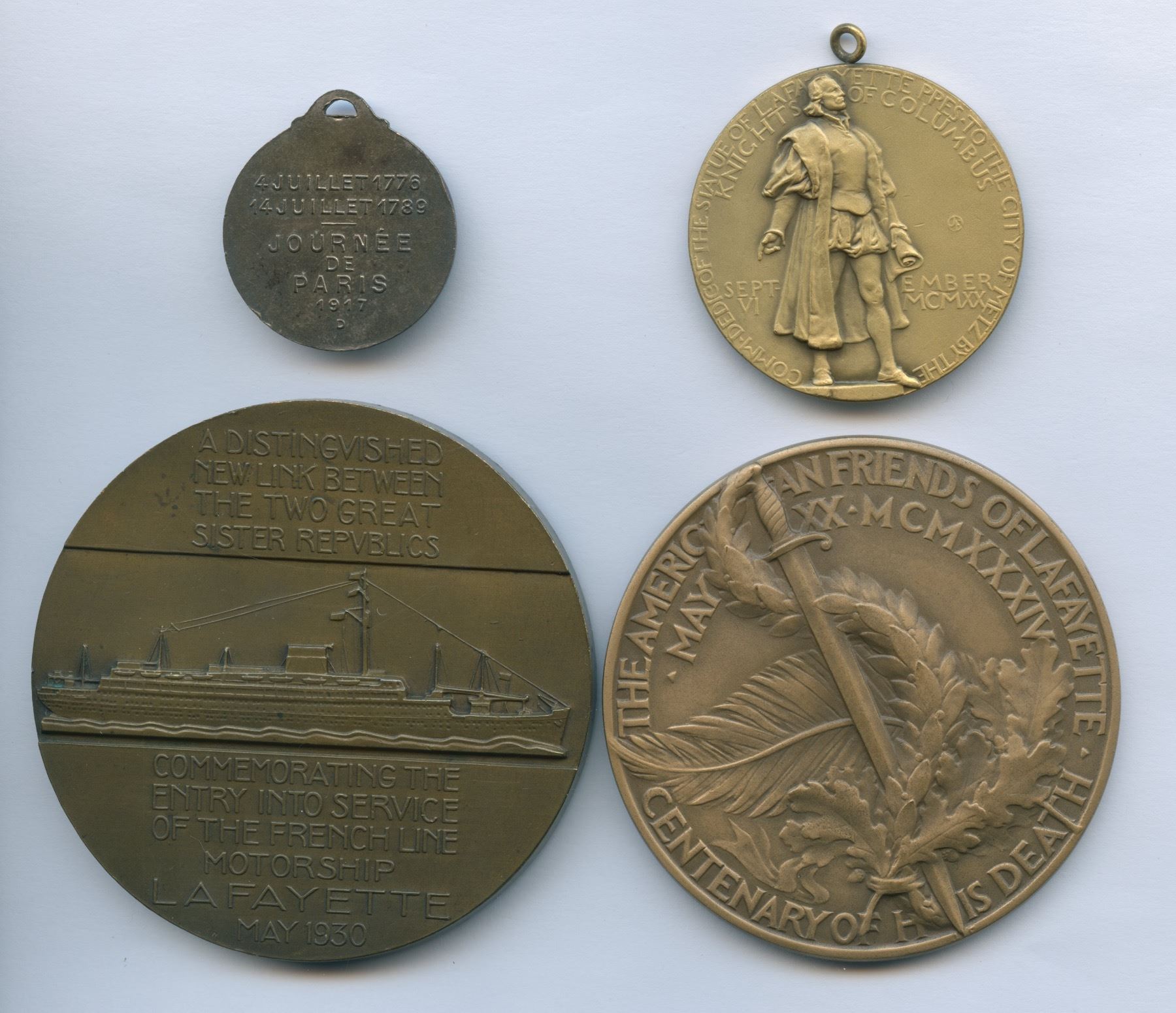 1.) 1920 Lafayette statue dedication medal in bronze. 41.5mm. 2.) 1930 Motorship Lafayette medal in bronze by M. Dalannoy. 3.) 1934 American Friends of Lafayette Centennial of his Death medal in bronze. 64mm. 4.) 1917 Journée de Paris medal Lafayette and Washington. 4pcs.