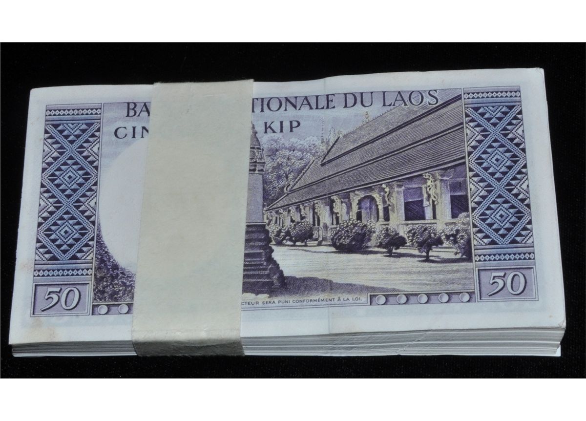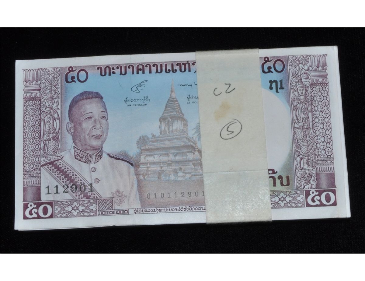 Laos Original Brick of 100 Banknotes - Cinquante KIP, consecutive Serial Numbers. Catalogue value $200. 100 Pcs.