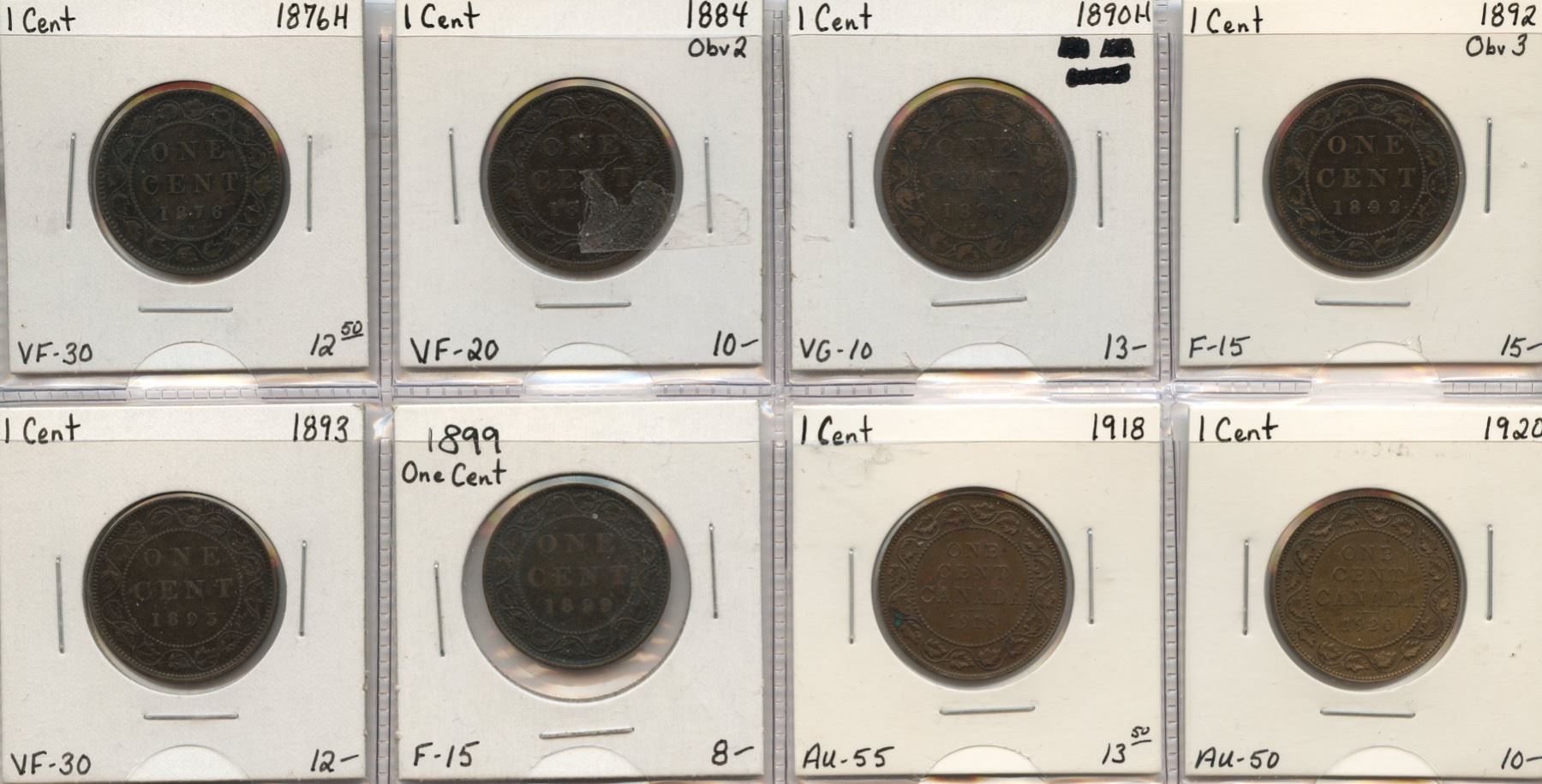 Mix of Victoria & George V large cents. 1876H; 1884 Obv 2; 1890H; 1892 Obv 3; 1893; 1899; 1918; 1920. 8 Pcs.