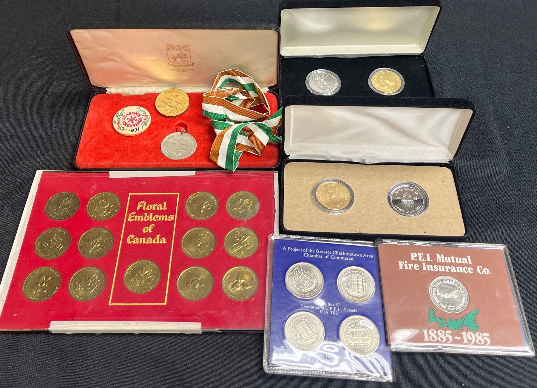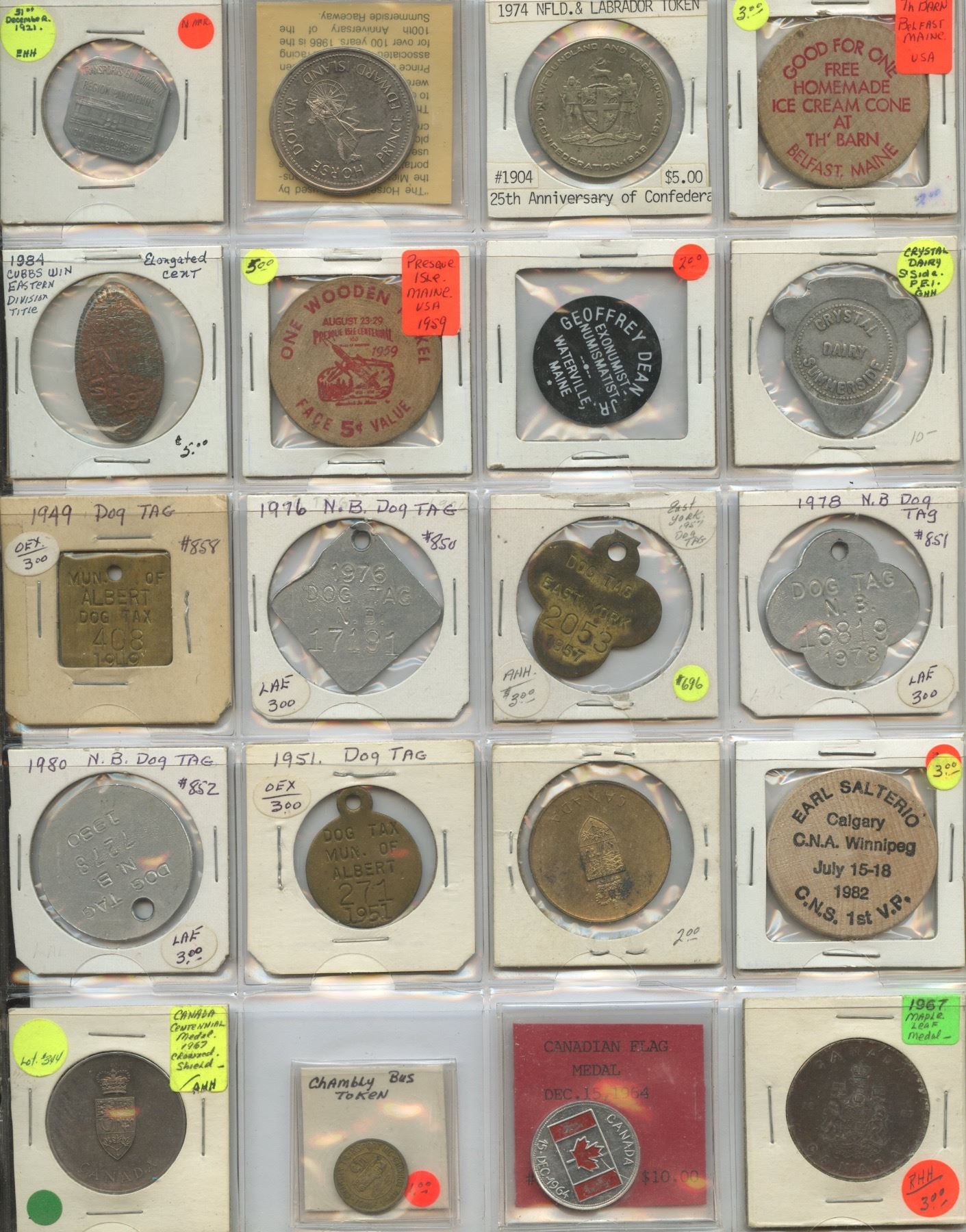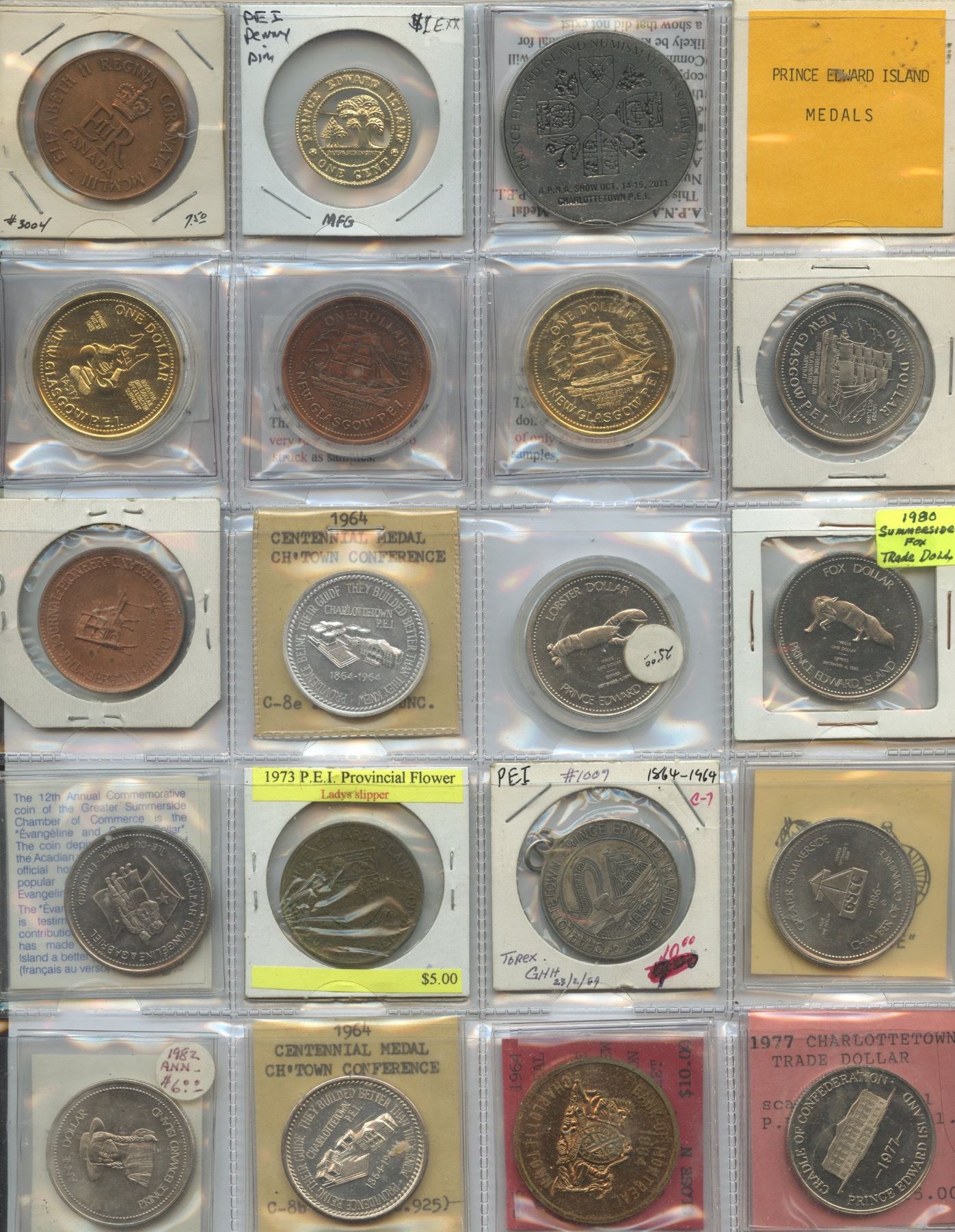 Many PEI pieces are included in this trade dollar, wooden nickel, dog tag, token, medal and coins, even a PEI sand dollar! Part of the Dickieson Collection. 256 Pcs.