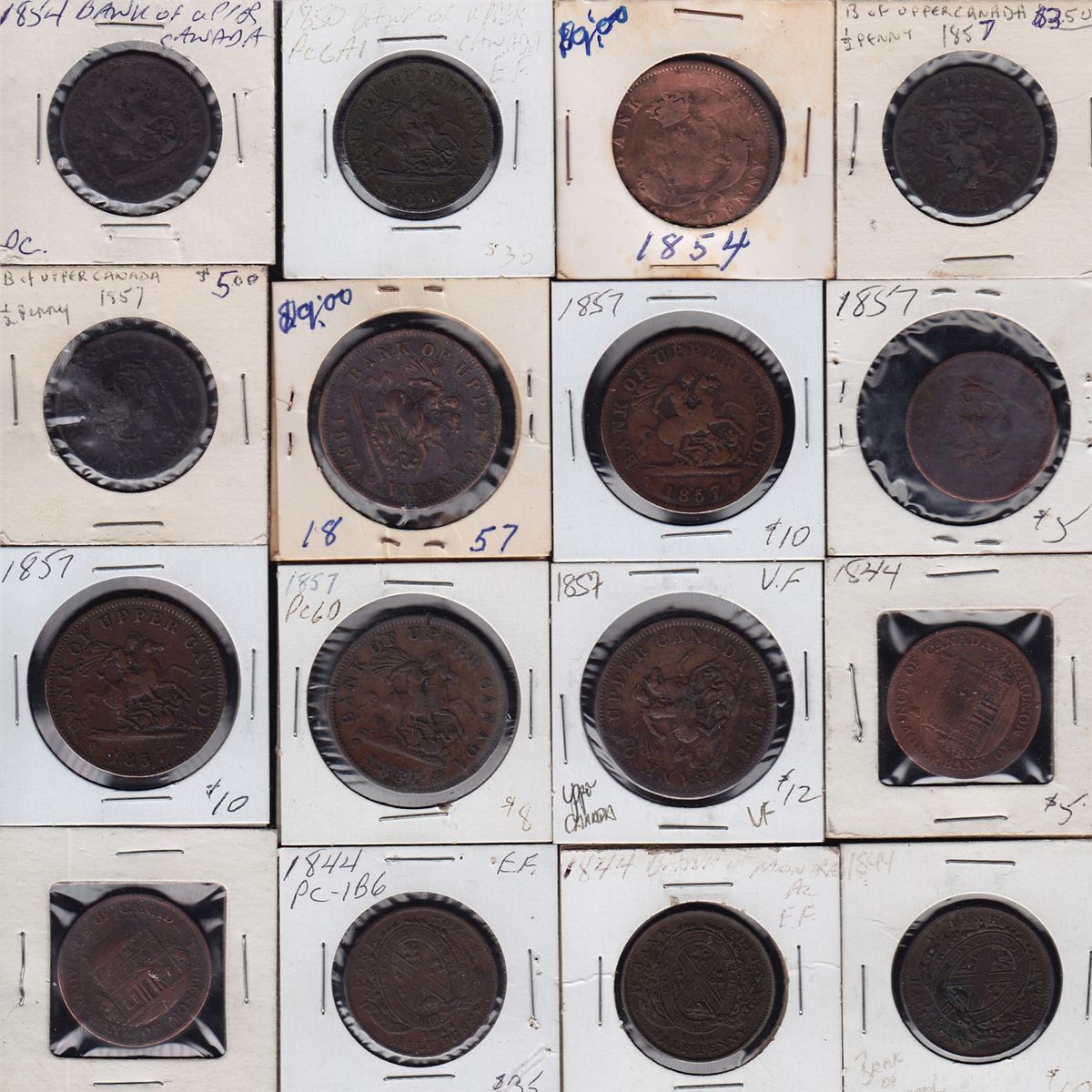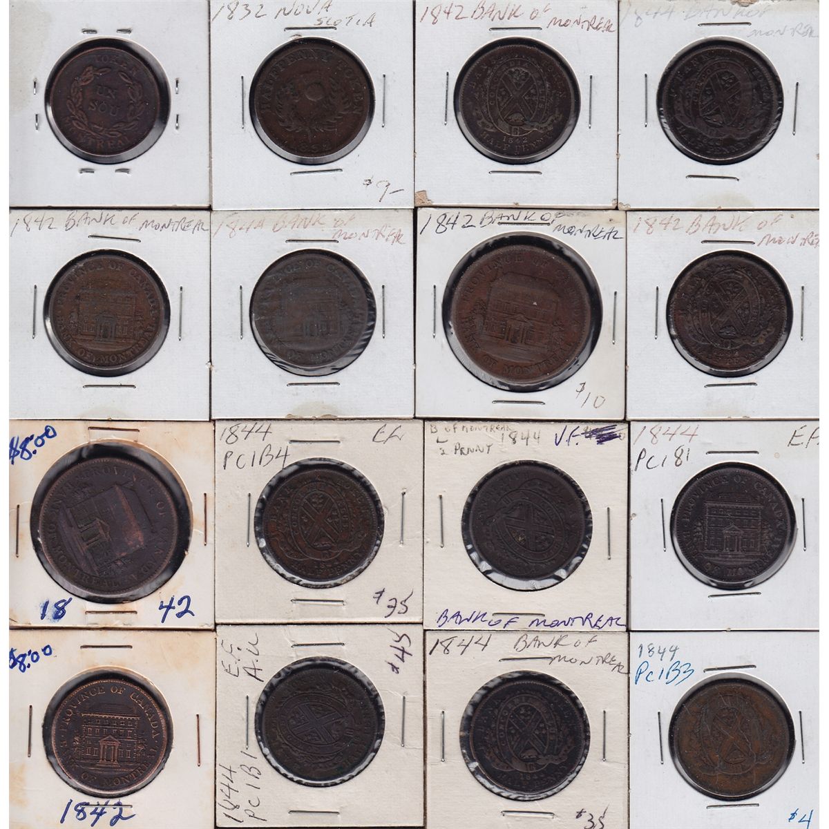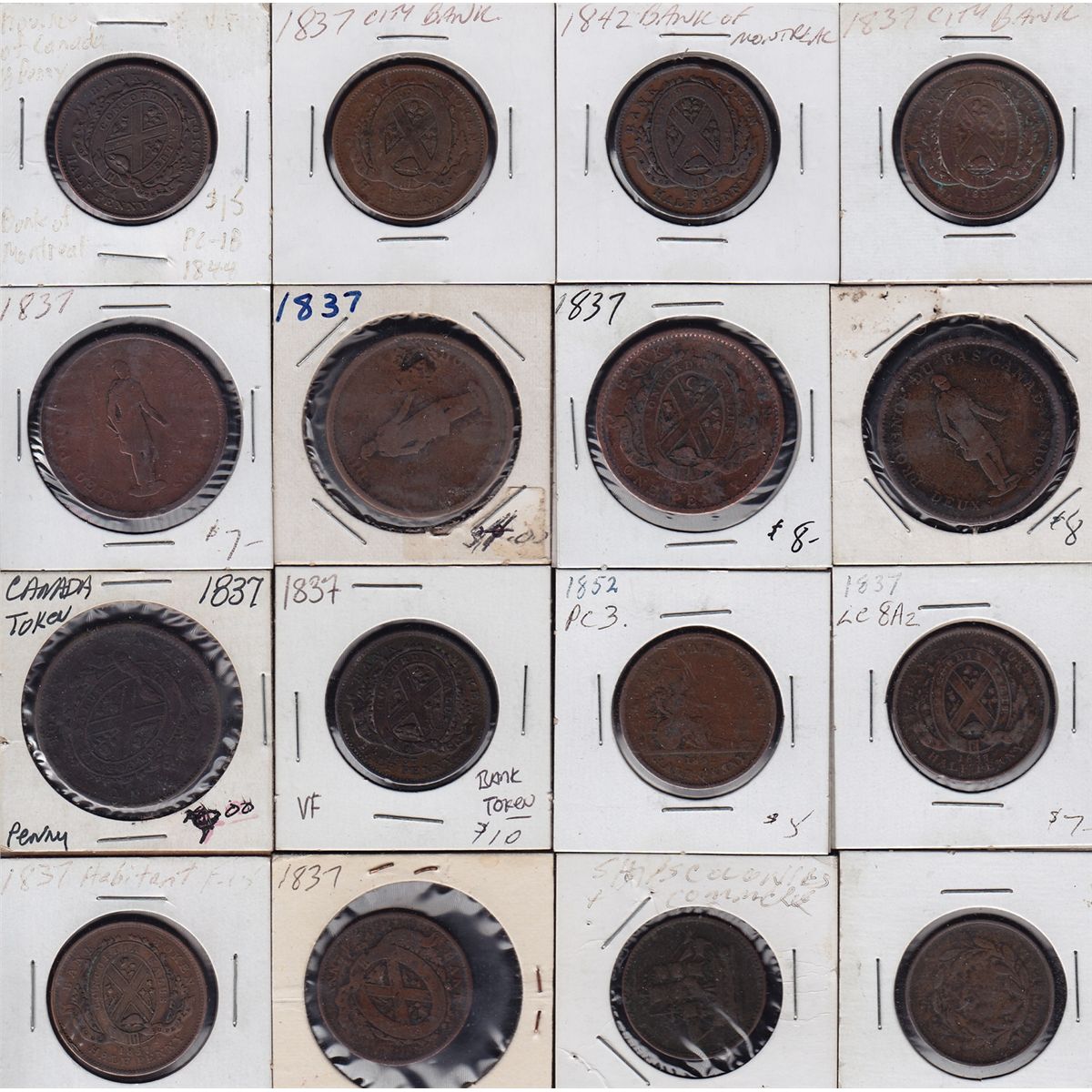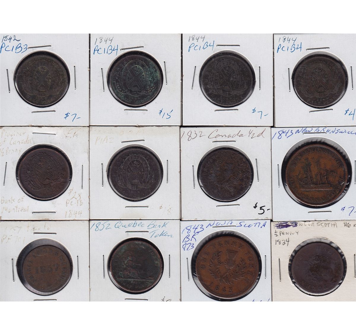 Large Lot of Tokens - Includes: Quebec Bank Tokens, Nova Scotia, PEI, New Brunswick, Bouquet Sous, Ships Colonies and Commerce and Upper Canada tokens, great assortment in various conditions. Should be viewed. 76 Pcs.