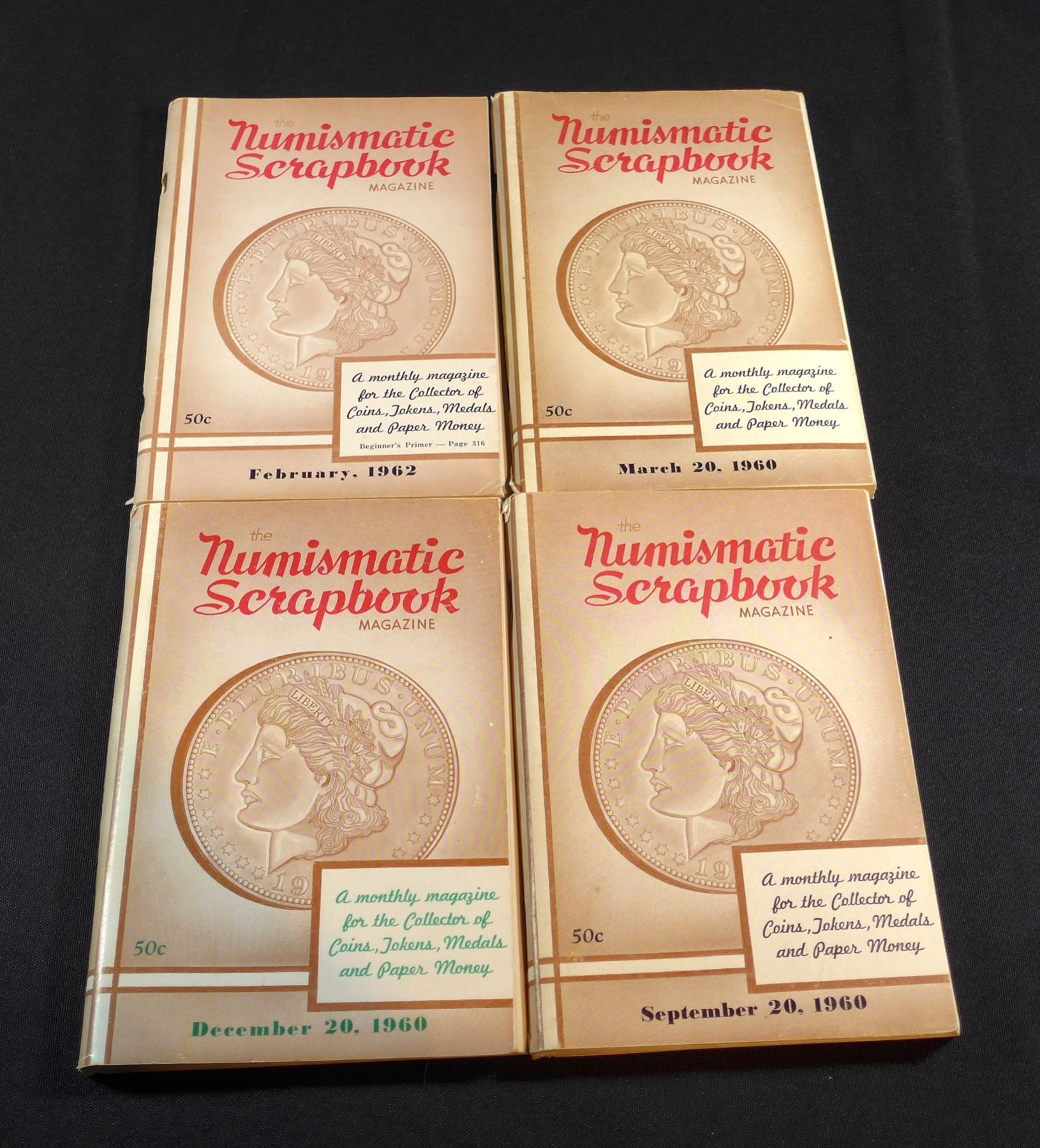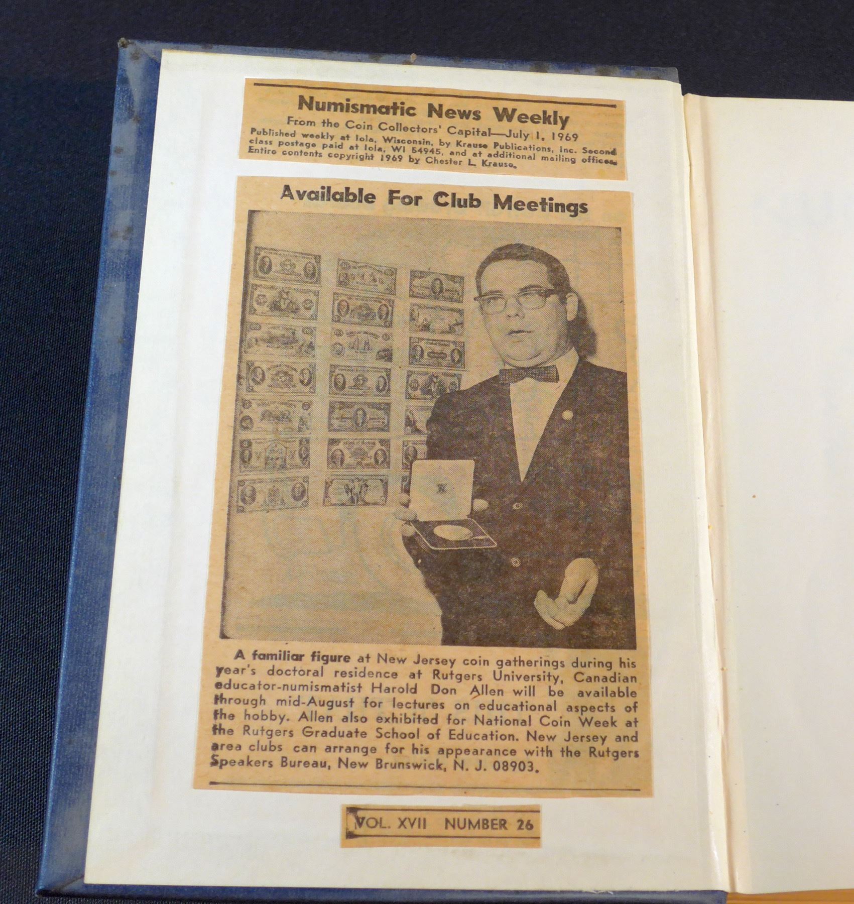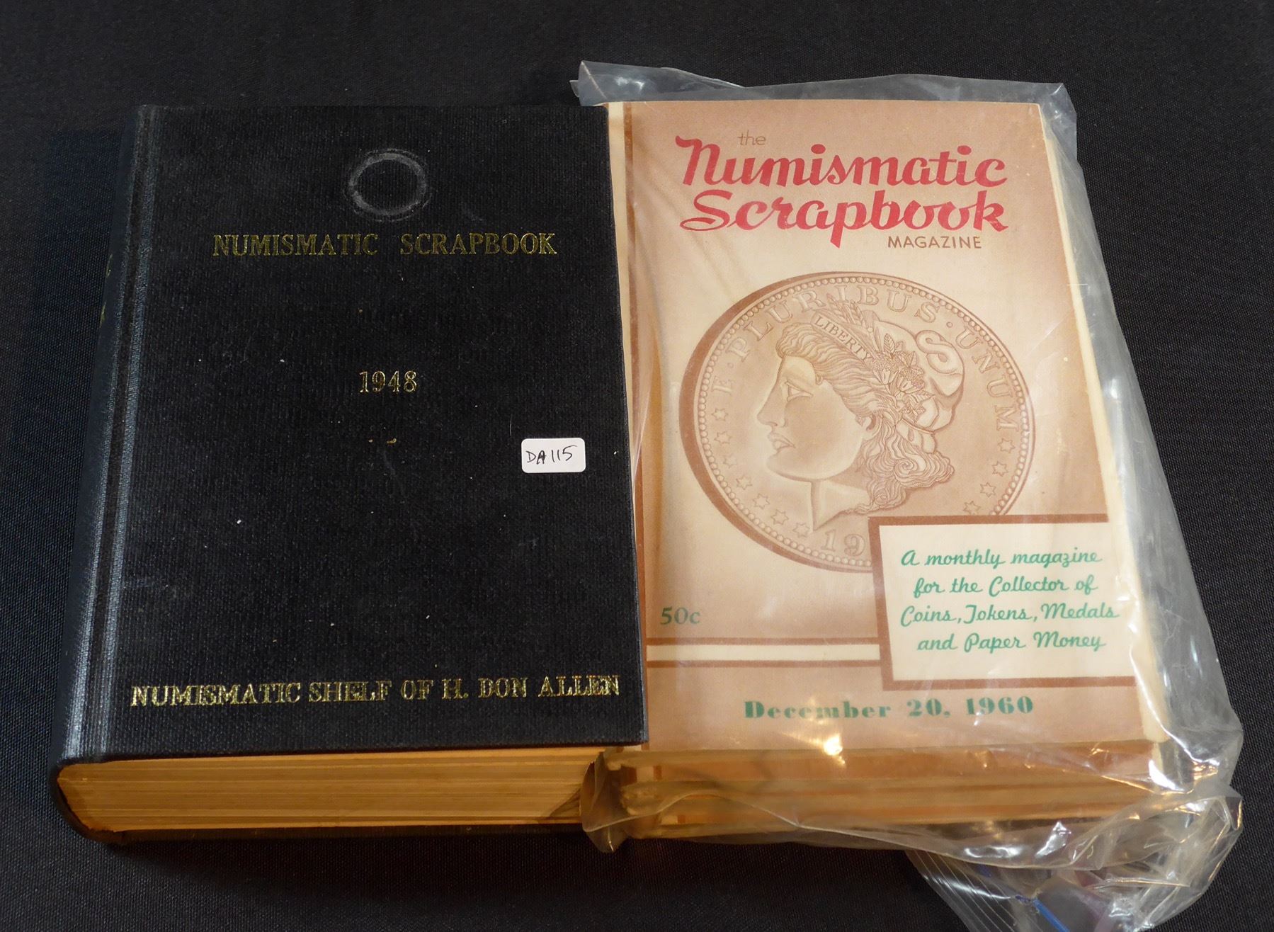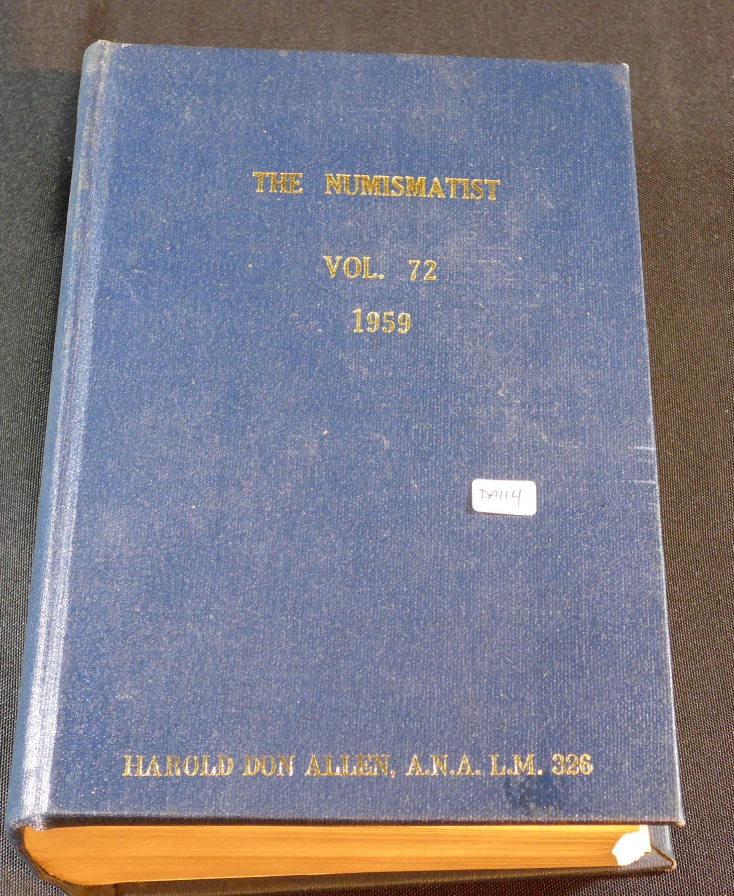 California State Numismatic Association (CSNA) Calcoin News Group: A selection of this quarterly magazine. Includes Money Talks, A Numismatic Anthology Selected from Calcoin News with H Don Allen's 1971 CSNA membership card. The Numismatist - Volume 72, 1959: A beautiful binding of the complete 1959 series of this American Numismatic Association publication. From the personal library of Harold Don Allen, A.N.A. L.M. 326. The Numismatic Scrapbook Magazine Group: A complete collection of the 1948 series bound and noted from the 'Numismatic Shelf of H. Don Allen'. Additionally, a few issues from 1960 and 1962 of the same publication.