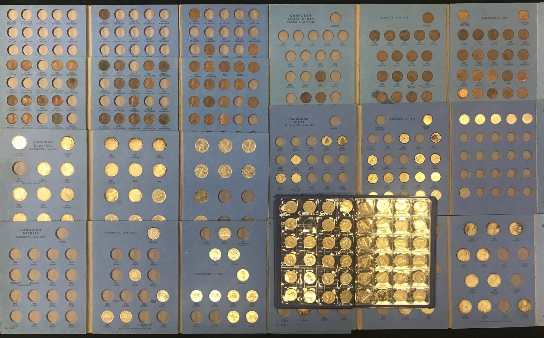 Lincoln Head Cents, Cdn one cents, five cents, ten cents, twenty-five cents. 8 books with plenty of coins.