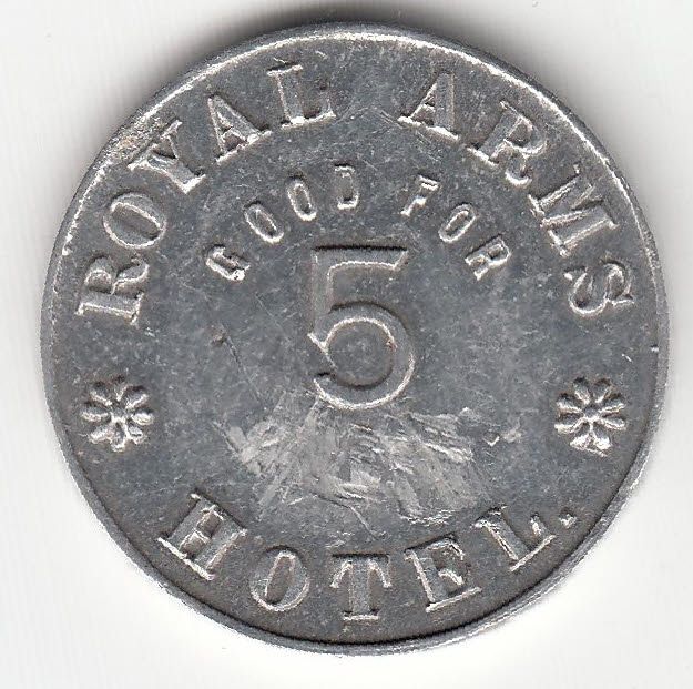Ler 1072o. Royal Arms Hotel Good for 5 (cents scratched off). Rev: This W Banfield scratched into surface. Uniface, aluminum, 24mm, EF.