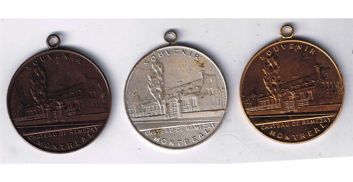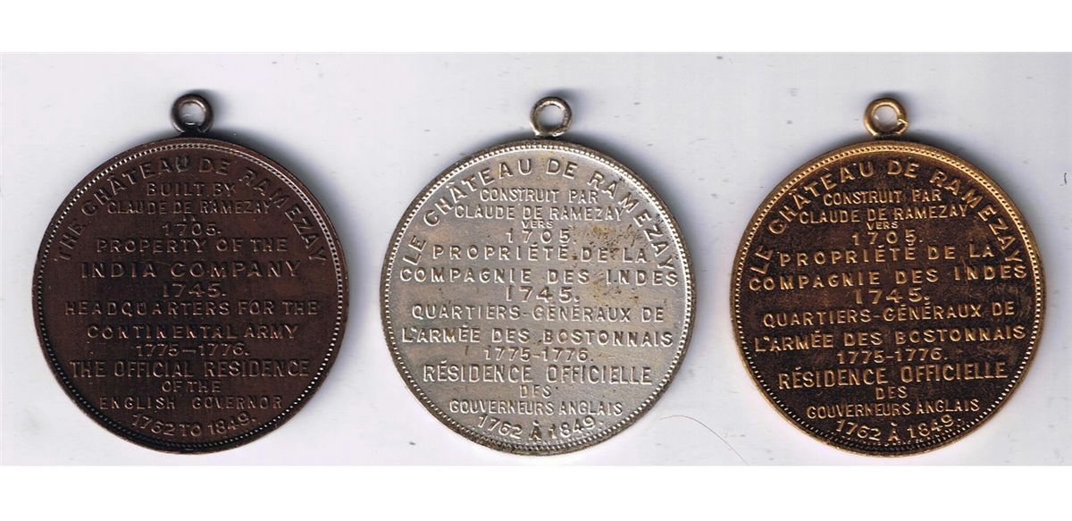 Ler 1612c Lot of 3. CH 1595-10. Includes: Souvenir/building/Chateau de Ramezay. The Chateau de Ramezay/ built by/Claude de Ramezay/in/1705/property of the/India Company/1745/Headquarters for the/Continental Army/1775-1776/the official residence/of the/English Governor/1762 to 1849. Copper, 38mm, looped. Silverplated, 38mm, looped. Gilded gold, 38mm, looped. 3 Pcs.