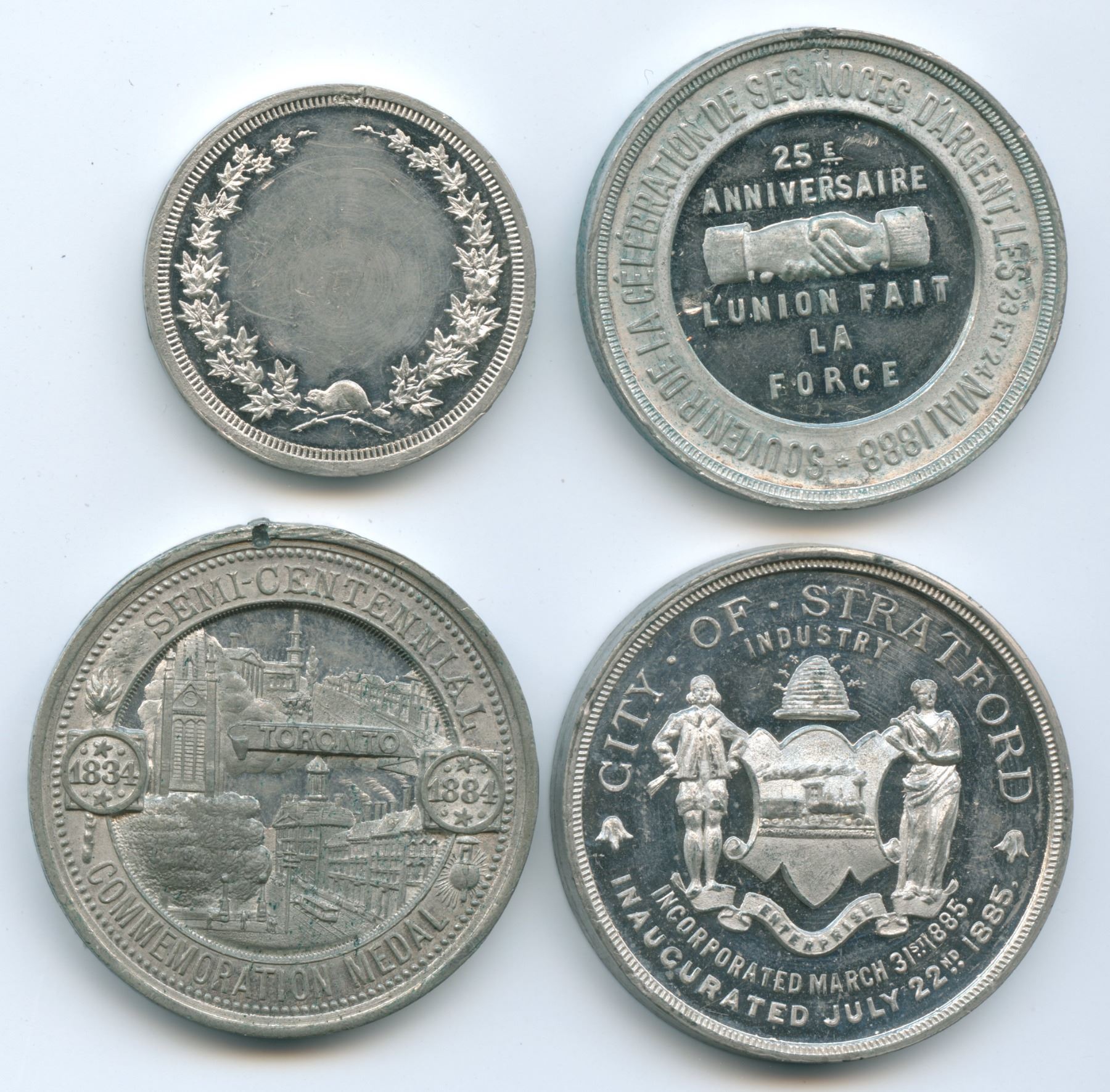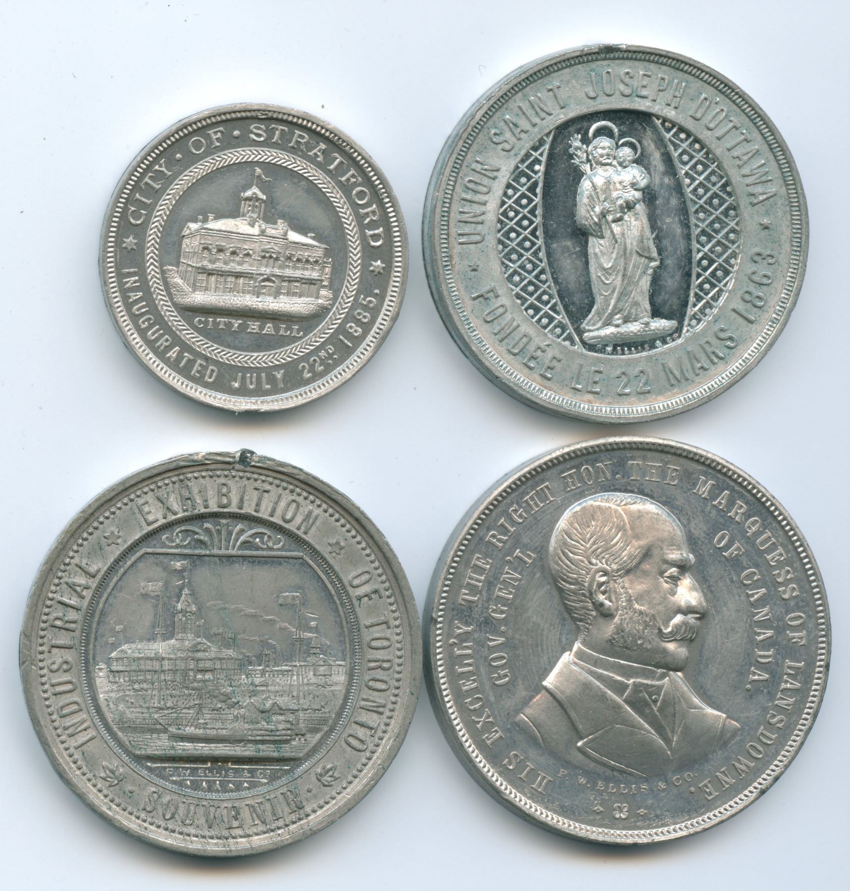 Lr.1775, Large 1885 City of Stratford, Marquess of Lansdowne, Governor General of Canada. Small 1885 City of Stratford mule (Lr.1791c reverse), Large 1834-1884 Toronto Centennial/Exhibition medal. Union Saint Joseph 22 Mars/March 1863. All four are white metal and in extremely fine condition. 4 pcs.