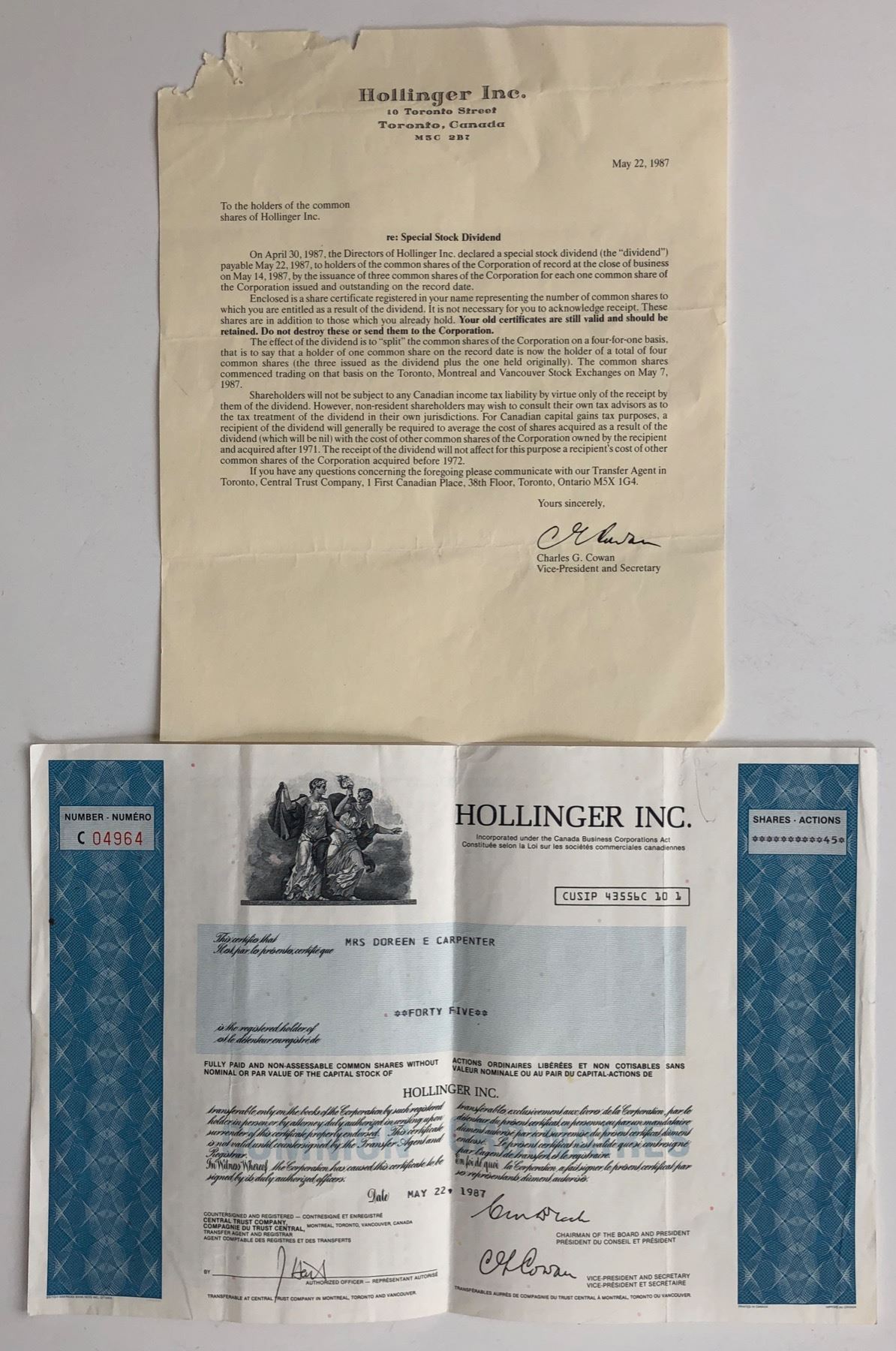 Letter and share document from Hollinger Inc. - Special Stock Dividend - May 22, 1987. CIBC Memorabilia - From the personal collection of Dennis M Carpenter, former Executive with the Canadian Imperial Bank of Commerce