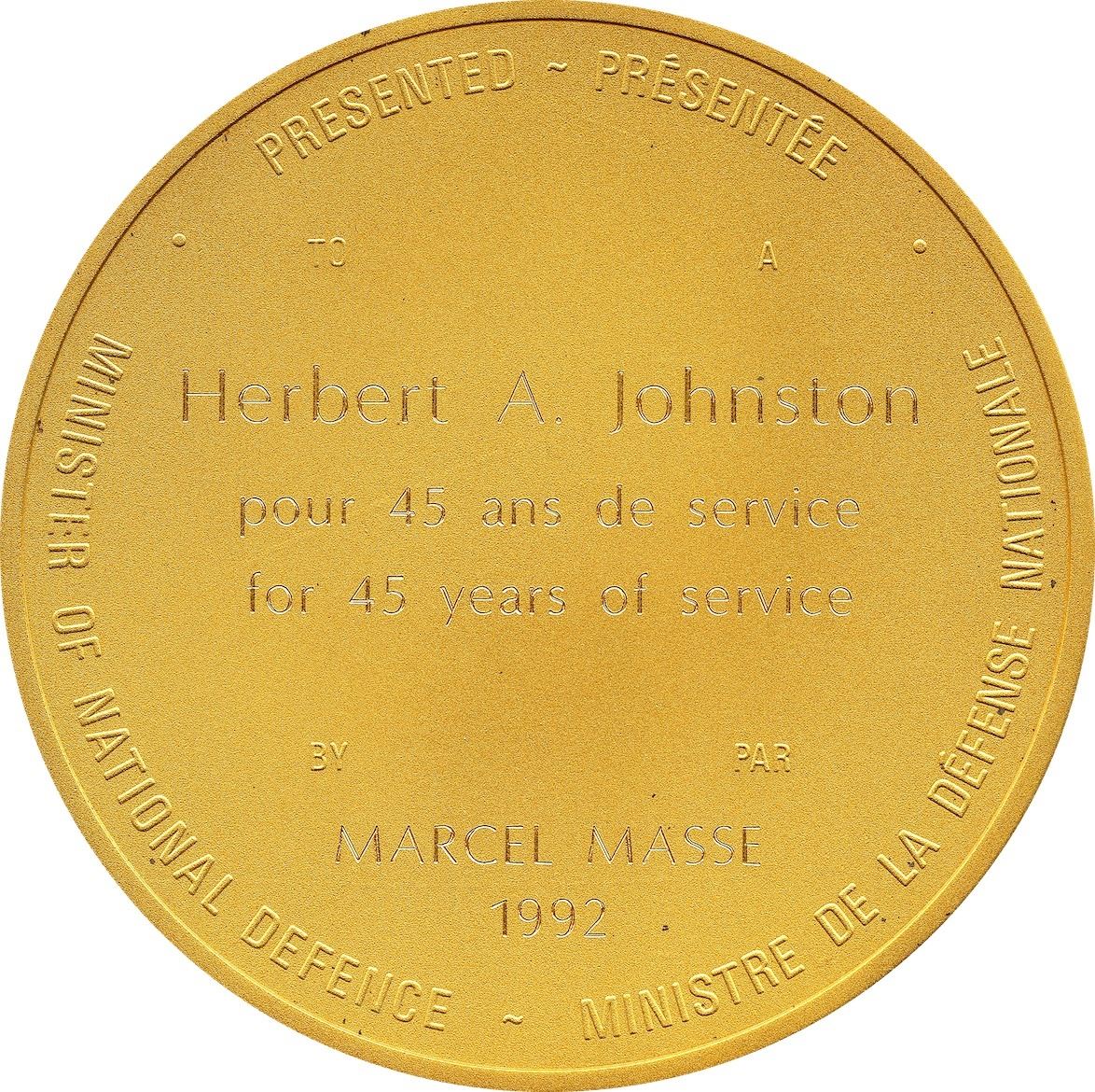 Goldine covered bronze, 75mm, Presented by the Minister of National Defense Marcel Masse to Herbert A. Johnston for 45 years of service, in case of issue; AE, 313.5g.