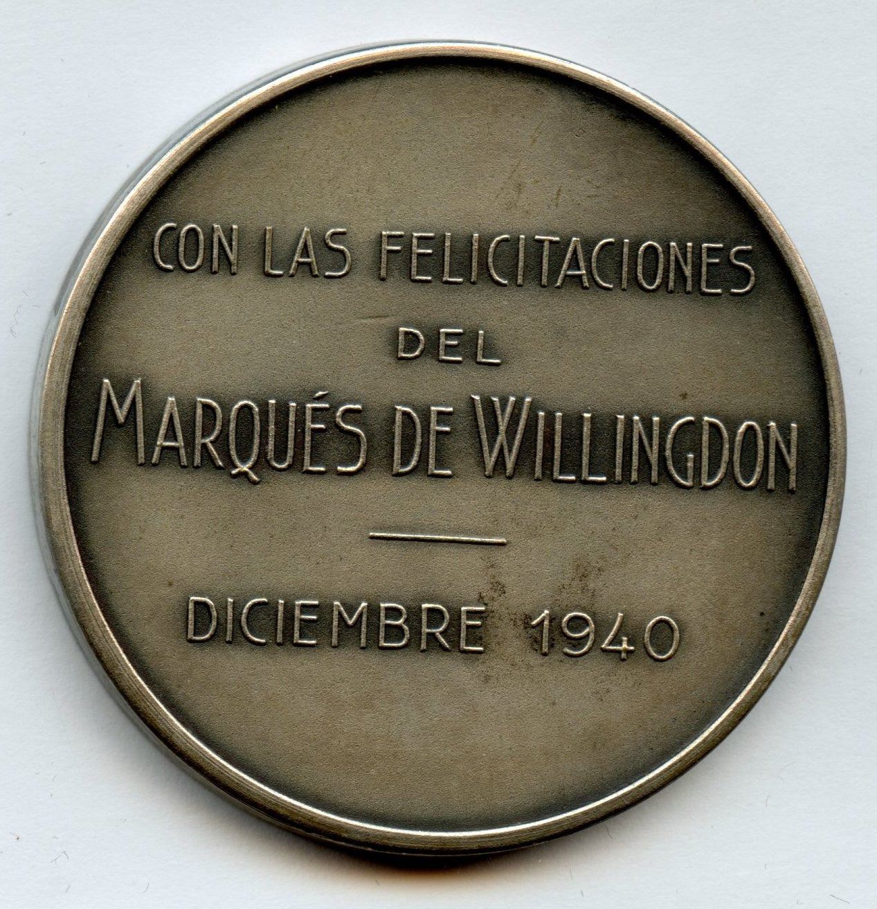 Willingdon, retired Governor General of Canada, Uruguay friendship medal, Wm, 50 mm, 59.1 gms of silver plated copper. Of interest to Governor General of Canada collectors.