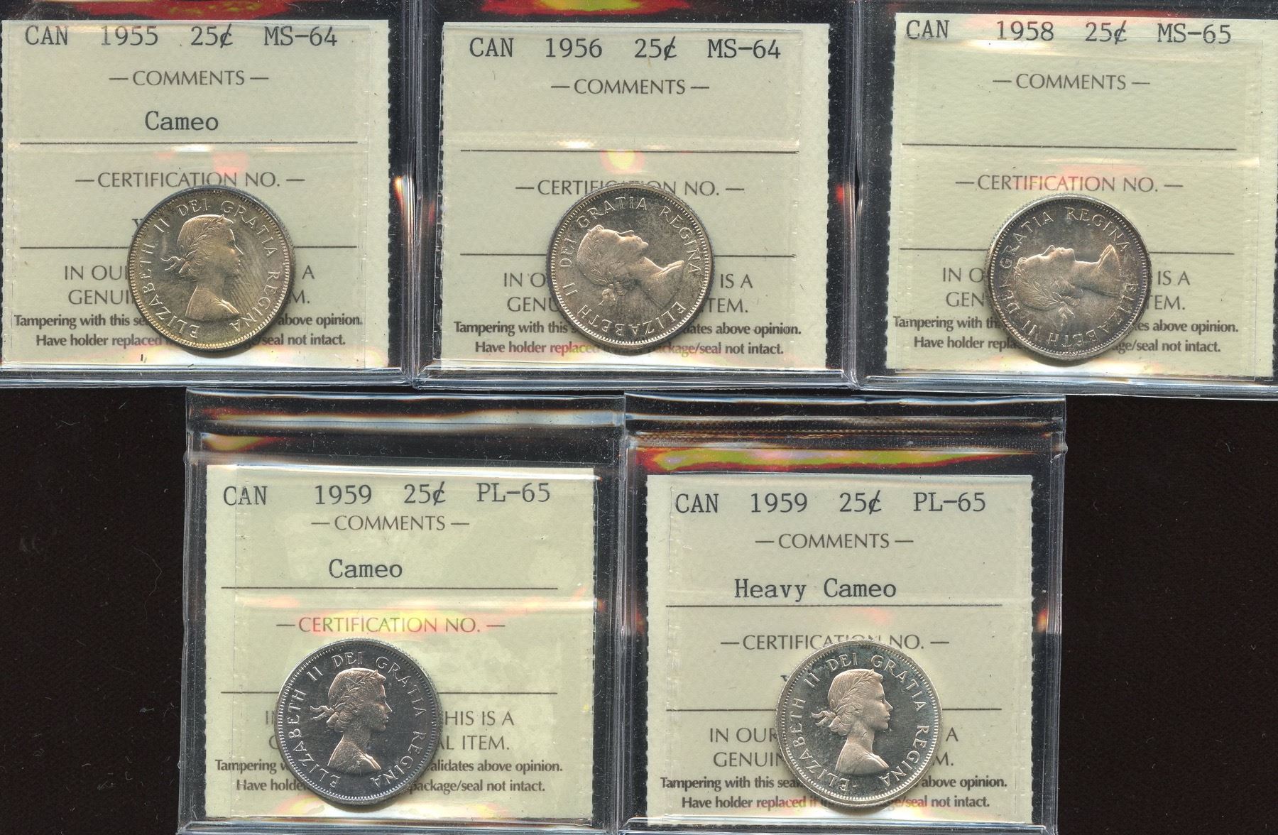 Includes: 1955 MS-64, cameo. 1956 MS-64. 1958 MS-65. 1959 PL-65, cameo. 1959 PL-65 heavy cameo. 5 Pcs.