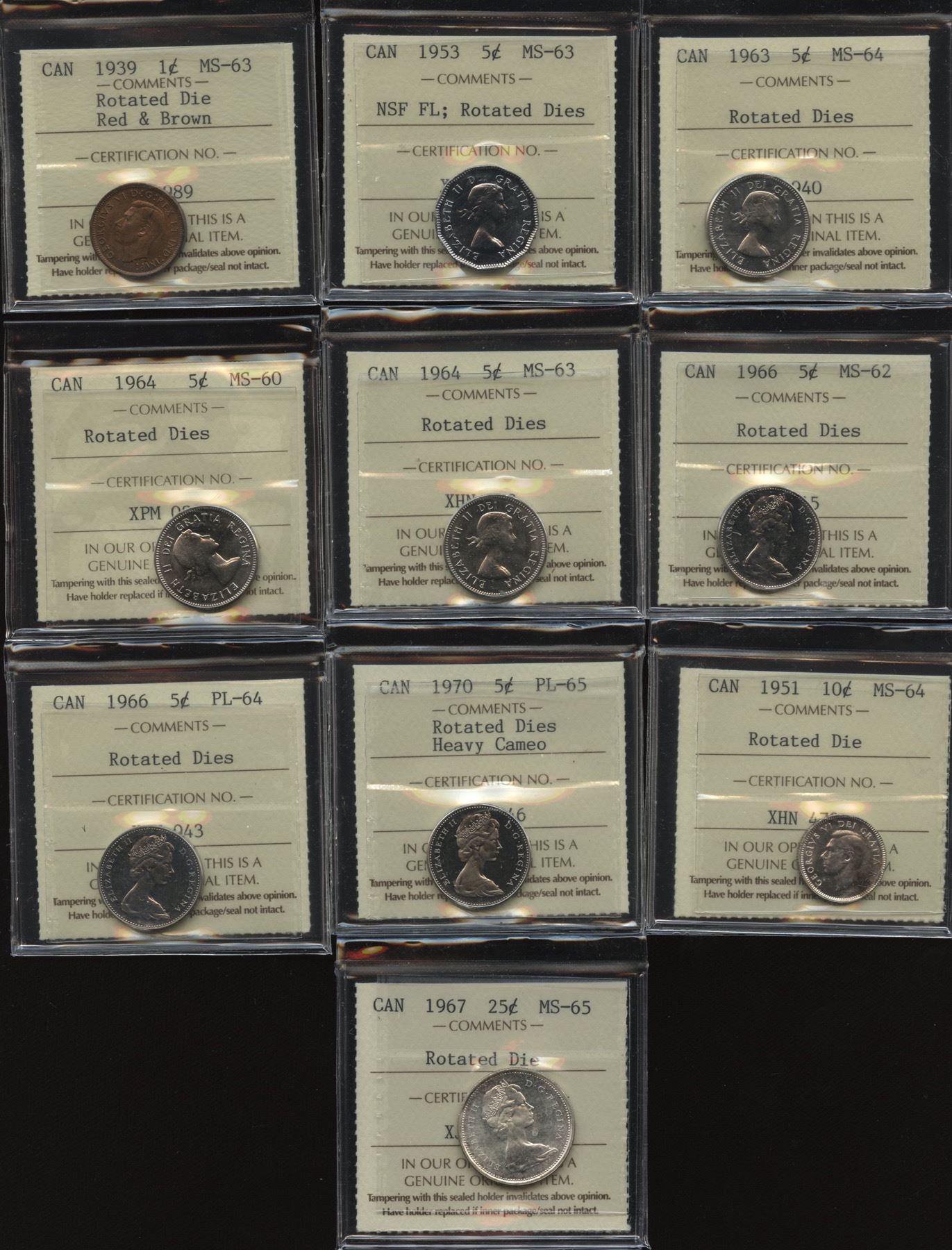 Includes: 1939 One Cent MS-63, Red & Brown. 1953 Five Cents MS-63, NSF, Far Leaf.1963 Five Cents MS-64. 1964 Five Cents MS-60. 1964 Five Cents MS-63. 1966 Five Cents MS-62. 1966 Five Cents PL-64. 1970 Five Cents PL-65, heavy cameo. 1951 Ten Cents MS-64. 1967 Twenty-Five Cents MS-65. 10 Pcs.