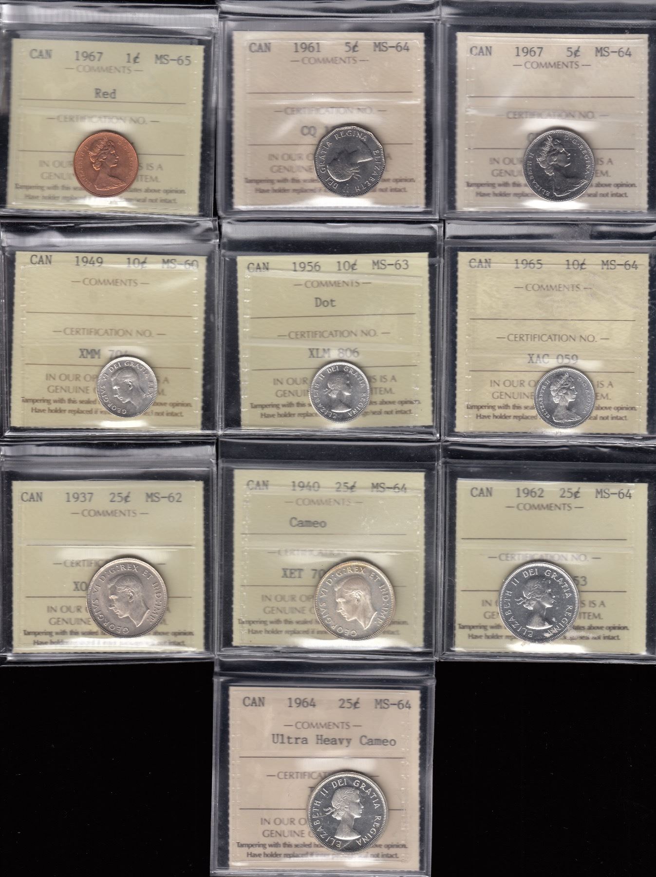 Lot includes: 1967 One Cents ICCS MS-65, red. 1961 Five Cents MS-64. 1967 Five Cents MS-64. 1949 Ten Cents MS-60. 1956 Ten Cents, dot MS-63. 1965 Ten Cents MS-64. 1937 Five Cents MS-62. 1940 Twenty-Five Cents MS-64, cameo. 1962 Twenty-Five Cents MS-64. 1964 Twenty-Five Cents MS-64, ultra heavy cameo. 10 Pcs.