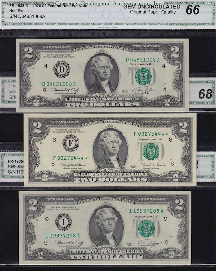 Lot of 10 Modern US CGA Graded GEM $1 & $2 Banknotes. - Includes: FR 1929K*, 2003 $1, GEM65; FR 1930F*, 2003A $1, GEM67; FR 1933K*, 2006 $1, GEM68; FR 1935A*, 1976 $2, GEM66; FR 1935B, 1976 $2, GEM66; FR 1935C, 1976 $2, GEM65; FR 1935D, 1976 $2, GEM66; FR 1936F*, 1995 $2, GEM68; FR 1935I, 1976 $2, Choice64; FR 1935I, 1976 $2, GEM67. 10 Pcs.