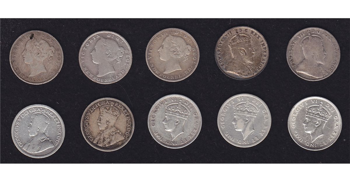 Lot of 10 Newfoundland Ten Cents - Includes: 1865 damaged; 1894 VG; 1896 VG; 1903 Fine with damage; 1904H VG; 1912 Good cleaned; 1917 VG; 1938 VF; 1940 VF; 1941 EF. 10 Pcs.