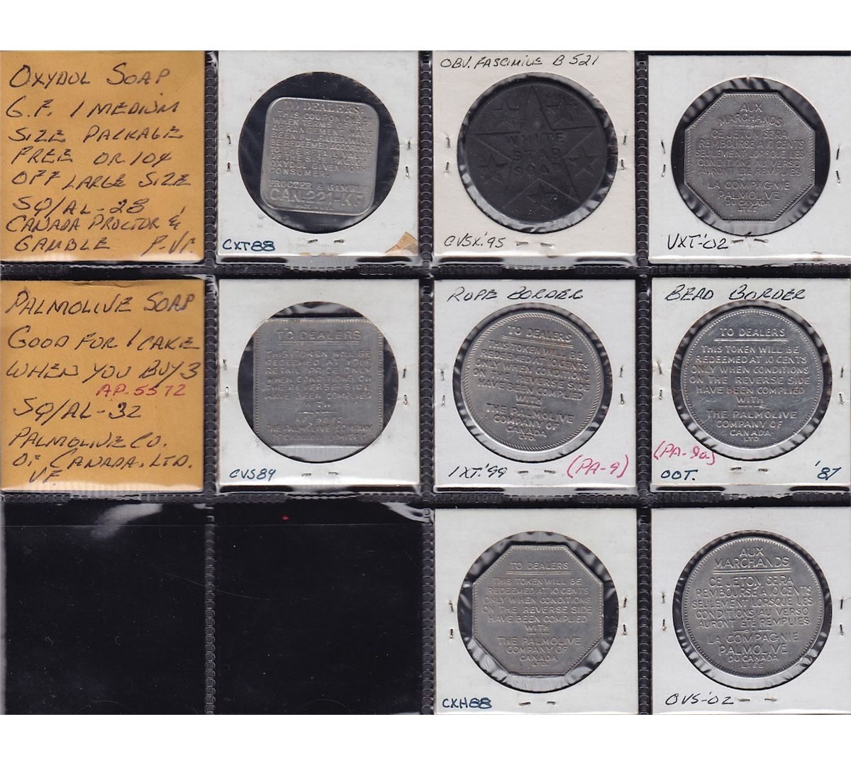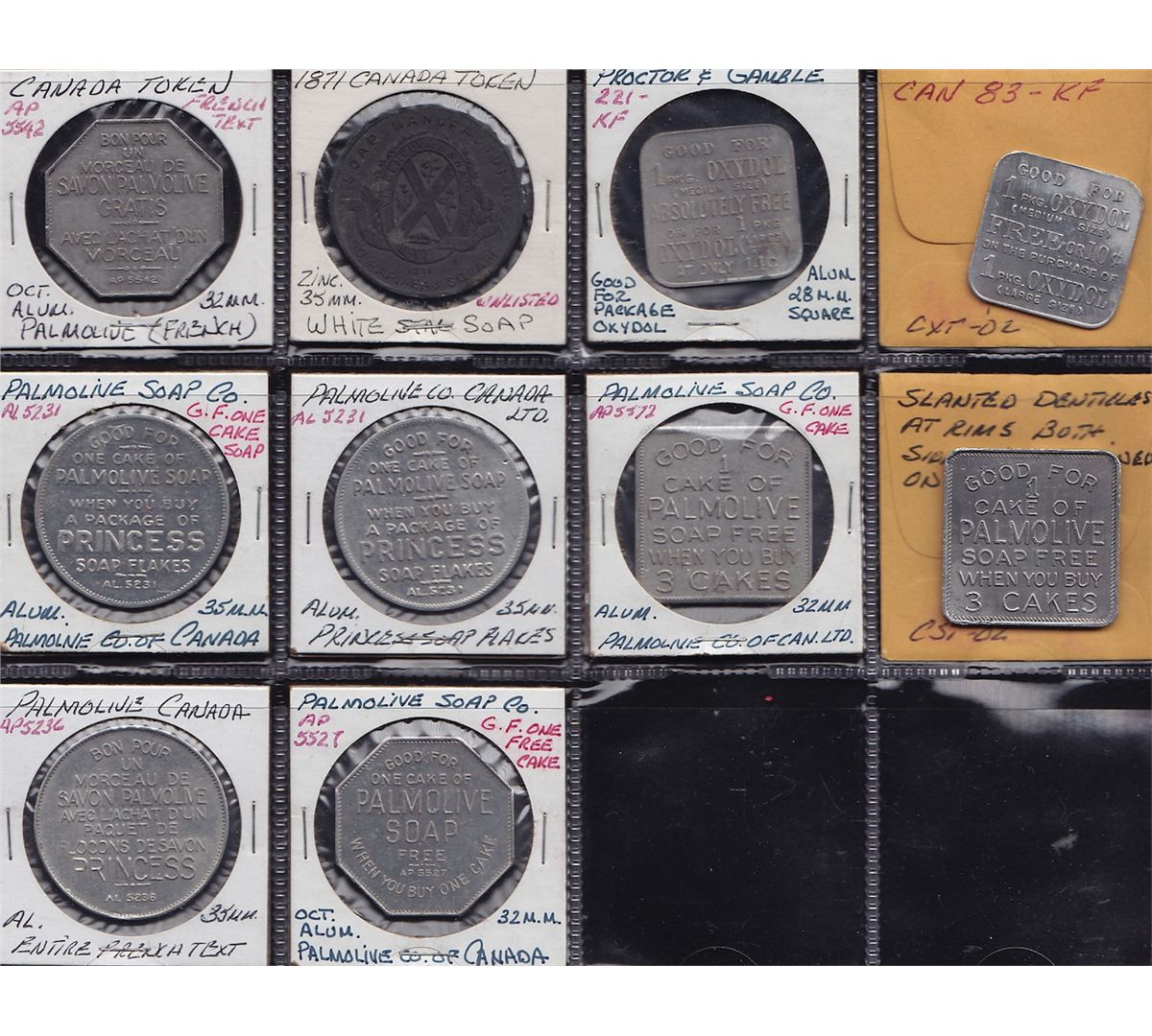 Lot of 10 Soap Tokens. Includes: 7 Palmolive Soap aluminum pieces, 2 Oxydol pieces and a White Star specimen that this cataloguer has not seen before. The obverse has what looks like a Bank of Montreal token crest, like BR 521, dated 1871, the reverse has a large star with White Star Soap in the middle. It is made of zinc, unlisted to our knowledge and very desirable. 10 Pcs.
