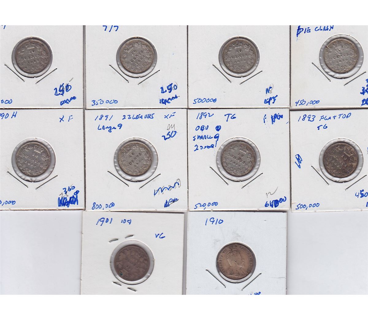 Lot of 10 Ten Cents Includes: 1887 VG, F; 1888 F; 1890H VG (damaged), F; 1891 VF; 1892 F; 1893 VF, toned; 1901 G; 1910 VG. 10 Pcs.